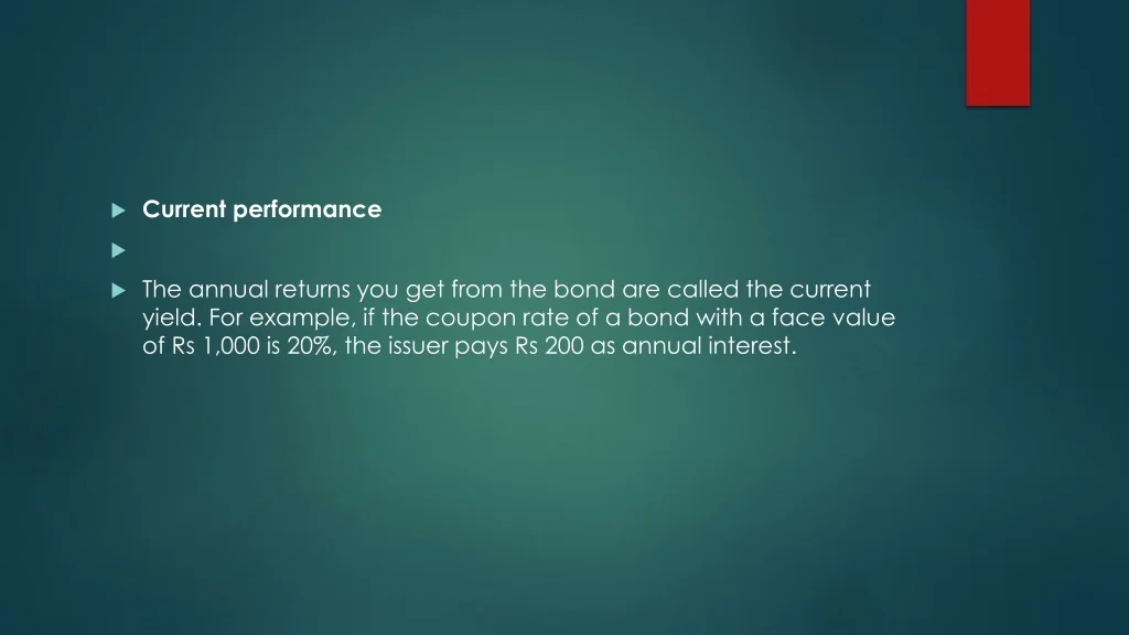 Current performance • The annual returns you get from the bond are called the current yield. For example, if the coupon rate of a bond with a face value of Rs 1,000 is 20%, the issuer pays Rs 200 as annual interest.