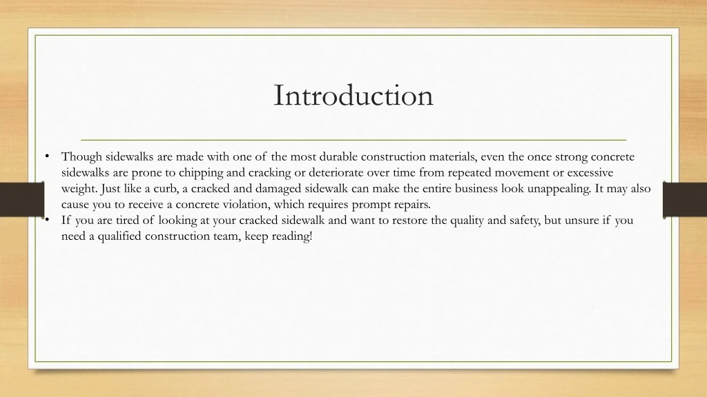 Introduction • Though sidewalks are made with one of the most durable construction materials, even the once strong concrete sidewalks are prone to chipping and cracking or deteriorate over time from repeated movement or excessive weight. Just like a curb, a cracked and damaged sidewalk can make the entire business look unappealing. It may also cause you to receive a concrete violation, which requires prompt repairs. • If you are tired of looking at your cracked sidewalk and want to restore the quality and safety, but unsure if you need a qualified construction team, keep reading!