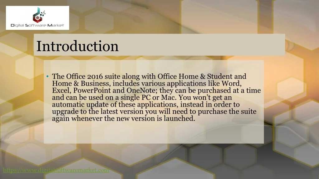 Introduction • The Office 2016 suite along with Office Home & Student and Home & Business, includes various applications like Word, Excel, PowerPoint and OneNote; they can be purchased at a time and can be used on a single PC or Mac. You won’t get an automatic update of these applications, instead in order to upgrade to the latest version you will need to purchase the suite again whenever the new version is launched. https://www.digitalsoftwaremarket.com