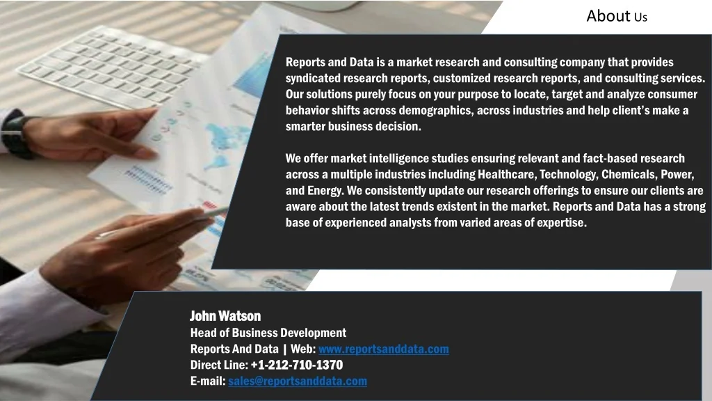 About Us Reports and Data is a market research and consulting company that provides syndicated research reports, customized research reports, and consulting services. Our solutions purely focus on your purpose to locate, target and analyze consumer behavior shifts across demographics, across industries and help client’s make a smarter business decision. We offer market intelligence studies ensuring relevant and fact-based research across a multiple industries including Healthcare, Technology, Chemicals, Power, and Energy. We consistently update our research offerings to ensure our clients are aware about the latest trends existent in the market. Reports and Data has a strong base of experienced analysts from varied areas of expertise. John Watson Head of Business Development Reports And Data | Web: www.reportsanddata.com Direct Line: +1-212-710-1370 E-mail: sales@reportsanddata.com Direct Line: +1 +1- -212 212- -710 710- -1370 1370 E-mail: sales@reportsanddata.com John John Watson Watson Head of Business Development Reports And Data | Web: www.reportsanddata.com