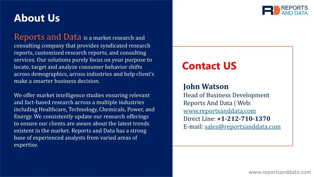 About Us Reports and Data is a market research and consulting company that provides syndicated research reports, customized research reports, and consulting services. Our solutions purely focus on your purpose to locate, target and analyze consumer behavior shifts across demographics, across industries and help client’s make a smarter business decision. Contact US John Watson Head of Business Development Reports And Data | Web: www.reportsanddata.com Direct Line: +1-212-710-1370 E-mail: sales@reportsanddata.com We offer market intelligence studies ensuring relevant and fact-based research across a multiple industries including Healthcare, Technology, Chemicals, Power, and Energy. We consistently update our research offerings to ensure our clients are aware about the latest trends existent in the market. Reports and Data has a strong base of experienced analysts from varied areas of expertise. www.reportsanddata.com