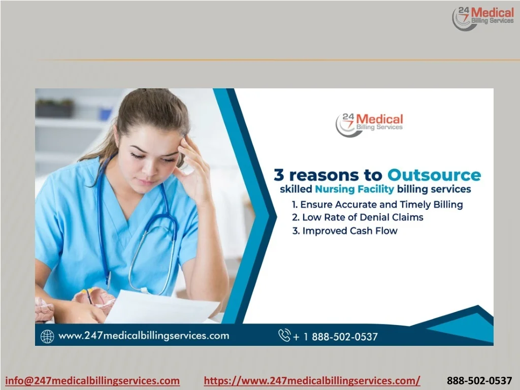 Conclusion Thus, it is clear from the above findings that skilled nursing homes mainly suffer from account receivable skills and a lack of a proper denial management system. Medical billing can be a daunting task requiring skilled manpower with multi-tasking talent that most skilled nursing homes failed to have due to low-profit margin. Therefore, there is a higher need for outsourcing the medical billing process to professional 24/7 Medical Billing Services. Our experts believe in delivering cutting-edge skilled nursing facility Medicare billing services by working as a specialized operational extension. We work across numerous medical specialties such as orthopedics and prosthetics, dermatology, alcohol and substance abuse, and many more such medical facilities. Read more : info@247medicalbillingservices.comhttps://www.247medicalbillingservices.com/888-502-0537