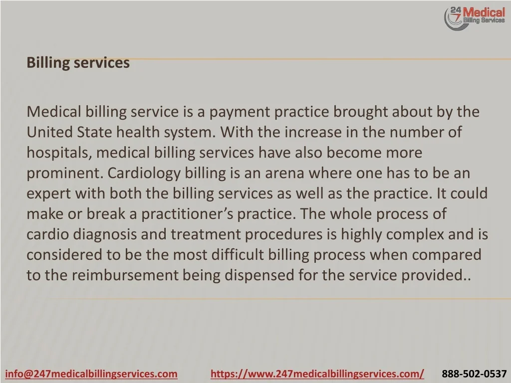 Billing services Medical billing service is a payment practice brought about by the United State health system. With the increase in the number of hospitals, medical billing services have also become more prominent. Cardiology billing is an arena where one has to be an expert with both the billing services as well as the practice. It could make or break a practitioner’s practice. The whole process of cardio diagnosis and treatment procedures is highly complex and is considered to be the most difficult billing process when compared to the reimbursement being dispensed for the service provided.. info@247medicalbillingservices.com https://www.247medicalbillingservices.com/ 888-502-0537