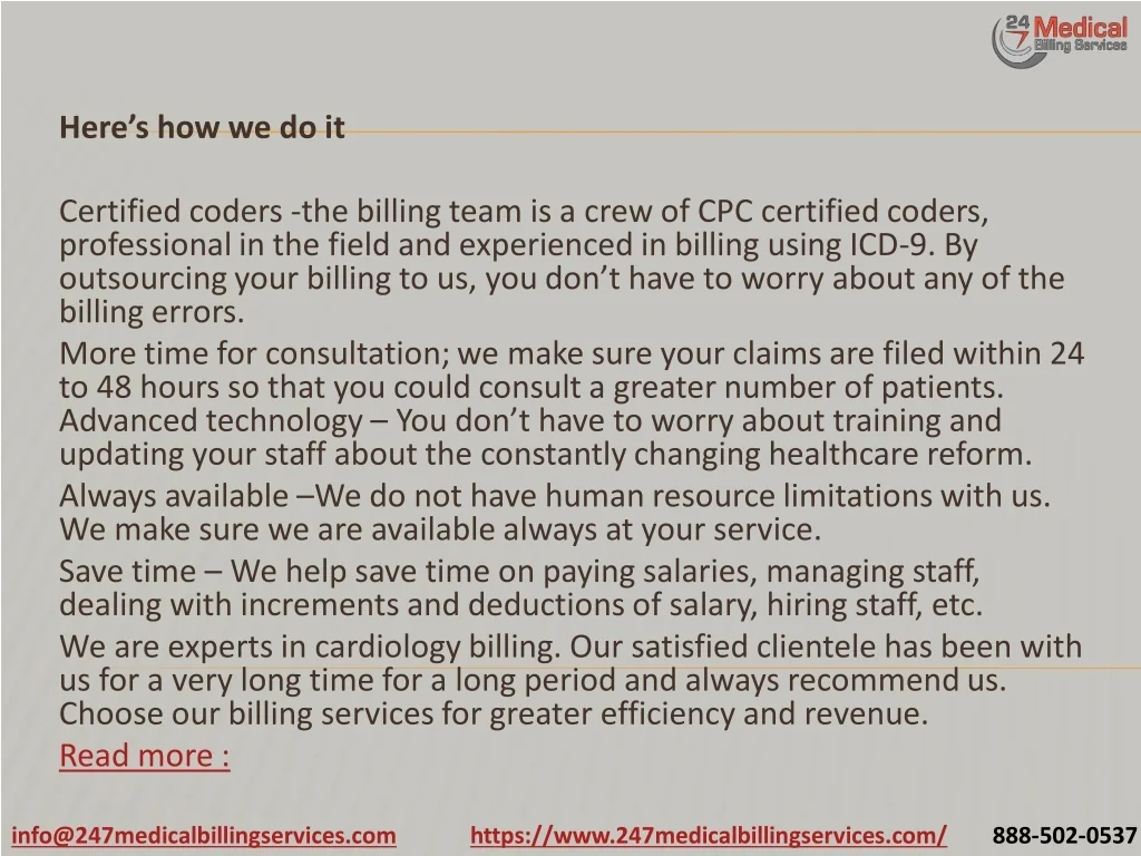 Here’s how we do it Certified coders -the billing team is a crew of CPC certified coders, professional in the field and experienced in billing using ICD-9. By outsourcing your billing to us, you don’t have to worry about any of the billing errors. More time for consultation; we make sure your claims are filed within 24 to 48 hours so that you could consult a greater number of patients. Advanced technology – You don’t have to worry about training and updating your staff about the constantly changing healthcare reform. Always available –We do not have human resource limitations with us. We make sure we are available always at your service. Save time – We help save time on paying salaries, managing staff, dealing with increments and deductions of salary, hiring staff, etc. We are experts in cardiology billing. Our satisfied clientele has been with us for a very long time for a long period and always recommend us. Choose our billing services for greater efficiency and revenue. Read more : info@247medicalbillingservices.com https://www.247medicalbillingservices.com/ 888-502-0537