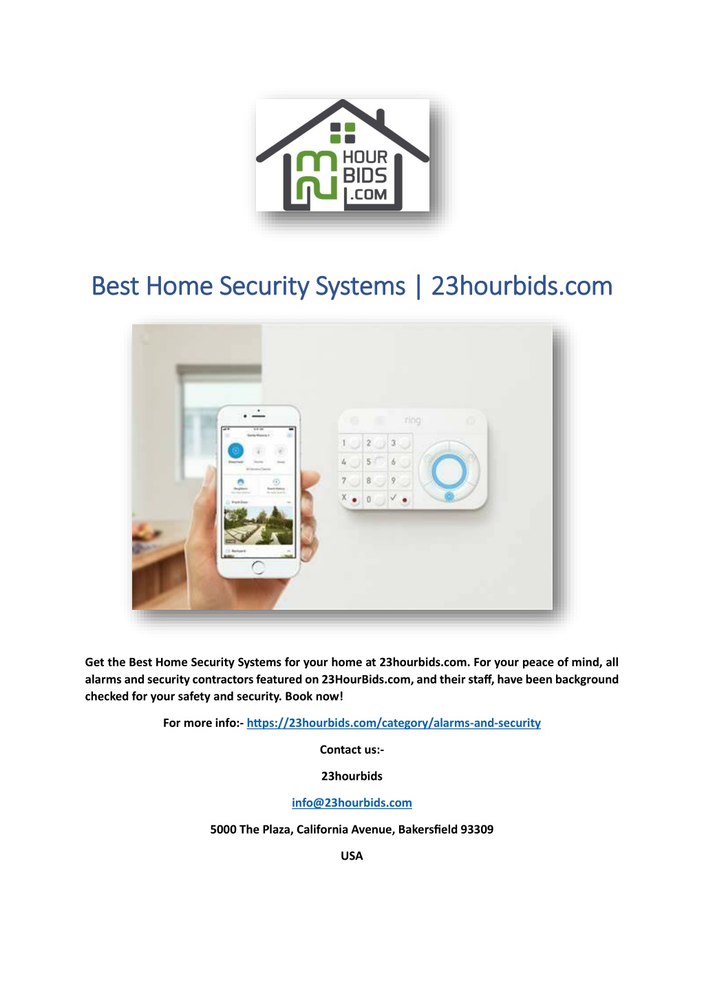 Best Home Security Systems | 23hourbids.com Best Home Security Systems | 23hourbids.com Get the Best Home Security Systems for your home at 23hourbids.com. For your peace of mind, all alarms and security contractors featured on 23HourBids.com, and their staff, have been background checked for your safety and security. Book now! For more info:- https://23hourbids.com/category/alarms-and-security Contact us:- 23hourbids info@23hourbids.com 5000 The Plaza, California Avenue, Bakersfield 93309 USA