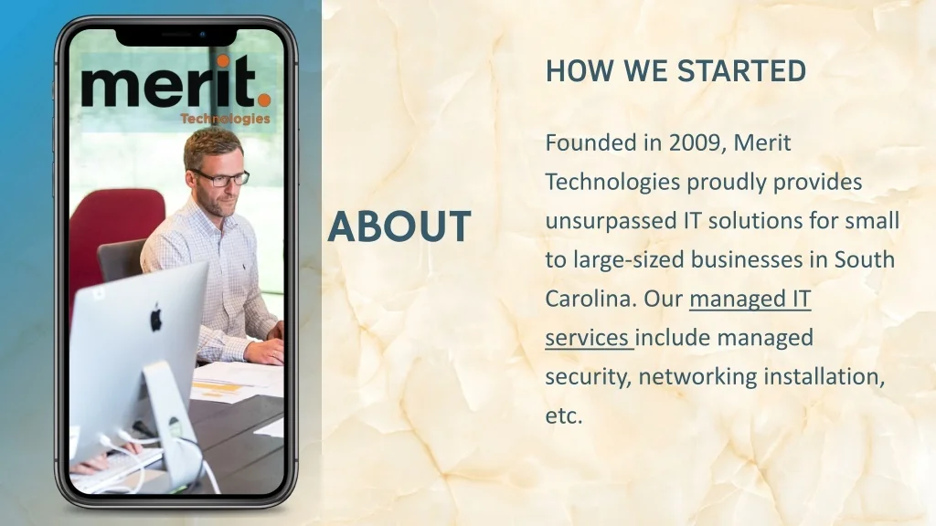 HOW WE STARTED Founded in 2009, Merit Technologies proudly provides unsurpassed IT solutions for small to large-sized businesses in South Carolina. Our managed IT services include managed security, networking installation, etc. ABOUT