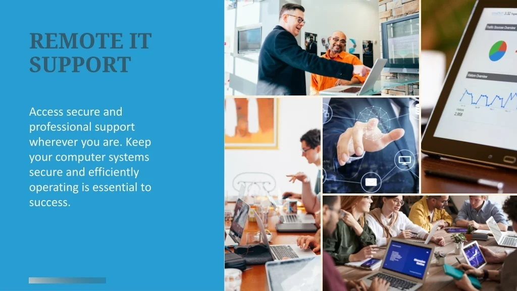 REMOTE IT SUPPORT Access secure and professional support wherever you are. Keep your computer systems secure and efficiently operating is essential to success.