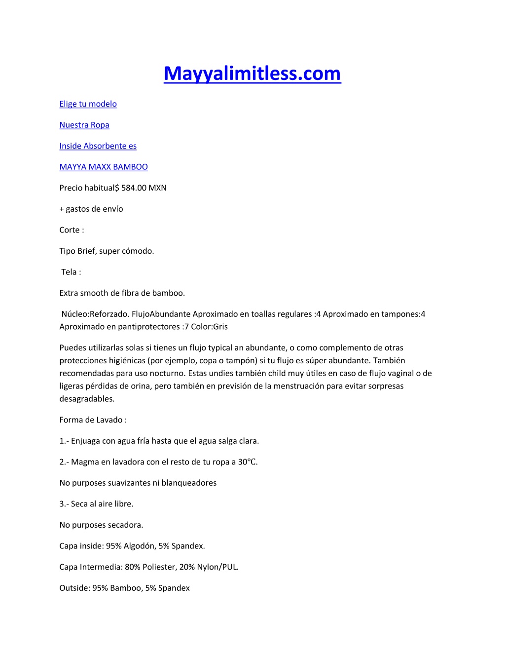 Mayyalimitless.com Elige tu modelo Nuestra Ropa Inside Absorbente es MAYYA MAXX BAMBOO Precio habitual$ 584.00 MXN + gastos de envío Corte : Tipo Brief, super cómodo. Tela : Extra smooth de fibra de bamboo. Núcleo:Reforzado. FlujoAbundante Aproximado en toallas regulares :4 Aproximado en tampones:4 Aproximado en pantiprotectores :7 Color:Gris Puedes utilizarlas solas si tienes un flujo typical an abundante, o como complemento de otras protecciones higiénicas (por ejemplo, copa o tampón) si tu flujo es súper abundante. También recomendadas para uso nocturno. Estas undies también child muy útiles en caso de flujo vaginal o de ligeras pérdidas de orina, pero también en previsión de la menstruación para evitar sorpresas desagradables. Forma de Lavado : 1.- Enjuaga con agua fría hasta que el agua salga clara. 2.- Magma en lavadora con el resto de tu ropa a 30℃. No purposes suavizantes ni blanqueadores 3.- Seca al aire libre. No purposes secadora. Capa inside: 95% Algodón, 5% Spandex. Capa Intermedia: 80% Poliester, 20% Nylon/PUL. Outside: 95% Bamboo, 5% Spandex