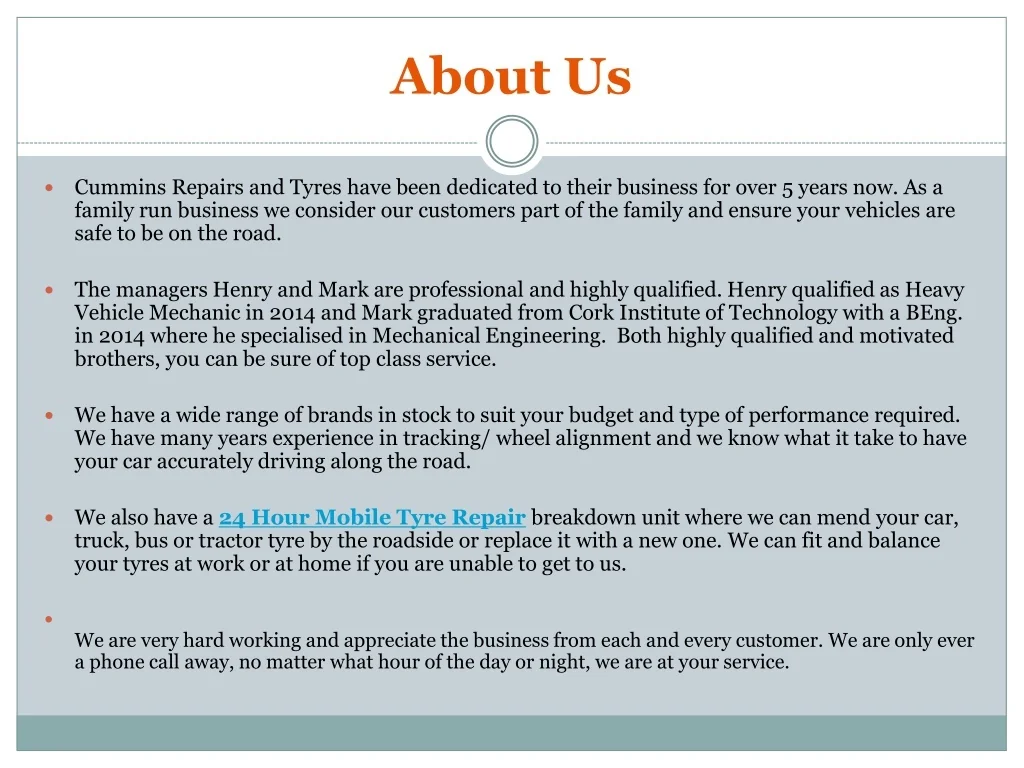 About Us Cummins Repairs and Tyres have been dedicated to their business for over 5 years now. As a family run business we consider our customers part of the family and ensure your vehicles are safe to be on the road. The managers Henry and Mark are professional and highly qualified. Henry qualified as Heavy Vehicle Mechanic in 2014 and Mark graduated from Cork Institute of Technology with a BEng. in 2014 where he specialised in Mechanical Engineering. Both highly qualified and motivated brothers, you can be sure of top class service. We have a wide range of brands in stock to suit your budget and type of performance required. We have many years experience in tracking/ wheel alignment and we know what it take to have your car accurately driving along the road. We also have a 24 Hour Mobile Tyre Repair breakdown unit where we can mend your car, truck, bus or tractor tyre by the roadside or replace it with a new one. We can fit and balance your tyres at work or at home if you are unable to get to us. We are very hard working and appreciate the business from each and every customer. We are only ever a phone call away, no matter what hour of the day or night, we are at your service.