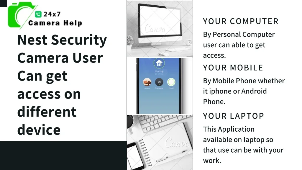 YOUR COMPUTER By Personal Computer user can able to get access. YOUR MOBILE Nest Security Camera User Can get access on different device By Mobile Phone whether it iphone or Android Phone. YOUR LAPTOP This Application available on laptop so that use can be with your work.