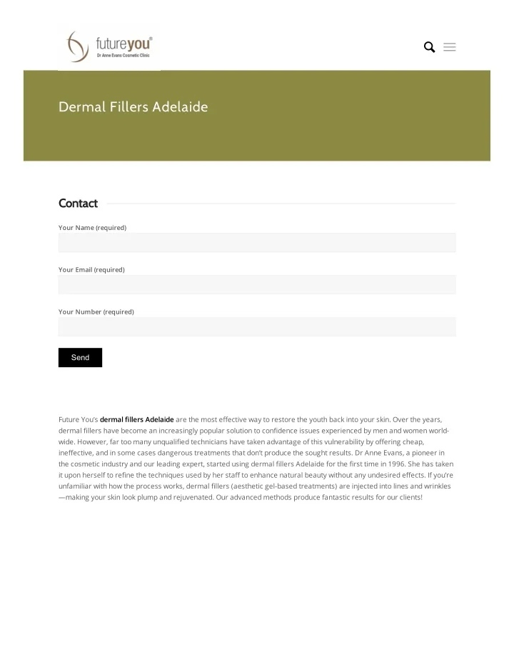 Dermal Fillers Adelaide Contact Your Name (required) Your Email (required) Your Number (required) Send Future You’s dermal ?llers Adelaide are the most e?ective way to restore the youth back into your skin. Over the years, dermal ?llers have become an increasingly popular solution to con?dence issues experienced by men and women world- wide. However, far too many unquali?ed technicians have taken advantage of this vulnerability by o?ering cheap, ine?ective, and in some cases dangerous treatments that don’t produce the sought results. Dr Anne Evans, a pioneer in the cosmetic industry and our leading expert, started using dermal ?llers Adelaide for the ?rst time in 1996. She has taken it upon herself to re?ne the techniques used by her sta? to enhance natural beauty without any undesired e?ects. If you’re unfamiliar with how the process works, dermal ?llers (aesthetic gel-based treatments) are injected into lines and wrinkles —making your skin look plump and rejuvenated. Our advanced methods produce fantastic results for our clients!