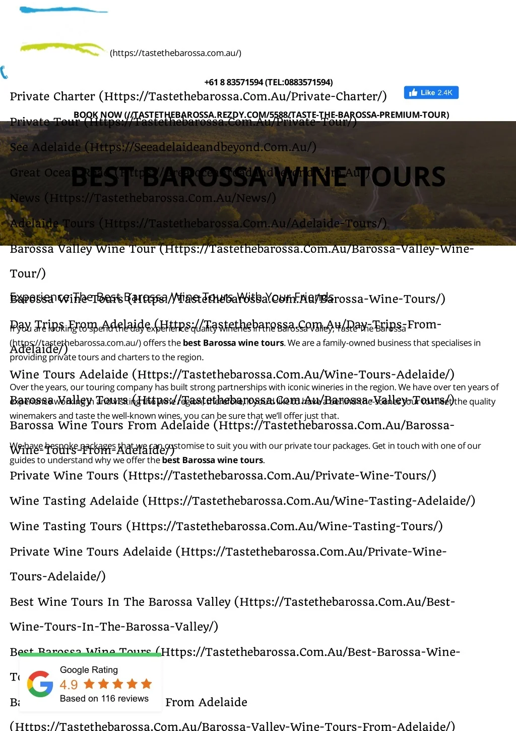 (https://tastethebarossa.com.au/) +61 8 83571594 (TEL:0883571594) Like 2.4K Private Charter (Https://Tastethebarossa.Com.Au/Private-Charter/) BOOK NOW (//TASTETHEBAROSSA.REZDY.COM/5588/TASTE-THE-BAROSSA-PREMIUM-TOUR) Private Tour (Https://Tastethebarossa.Com.Au/Private-Tour/) See Adelaide (Https://Seeadelaideandbeyond.Com.Au/) BEST BAROSSA WINE TOURS News (Https://Tastethebarossa.Com.Au/News/) Great Ocean Road (Https://Greatoceanroadandbeyond.Com.Au/) Adelaide Tours (Https://Tastethebarossa.Com.Au/Adelaide-Tours/) Barossa Valley Wine Tour (Https://Tastethebarossa.Com.Au/Barossa-Valley-Wine- Tour/) Experience The Best Barossa Wine Tours With Your Friends Barossa Wine Tours (Https://Tastethebarossa.Com.Au/Barossa-Wine-Tours/) Day Trips From Adelaide (Https://Tastethebarossa.Com.Au/Day-Trips-From- If you are looking to spend the day experience quality wineries in the Barossa Valley, Taste The Barossa (https://tastethebarossa.com.au/) o?ers the best Barossa wine tours. We are a family-owned business that specialises in providing private tours and charters to the region. Adelaide/) Wine Tours Adelaide (Https://Tastethebarossa.Com.Au/Wine-Tours-Adelaide/) Over the years, our touring company has built strong partnerships with iconic wineries in the region. We have over ten years of experience working in and visiting the wine region; therefore, if you’d like to have a behind-the-scenes tour to meet the quality winemakers and taste the well-known wines, you can be sure that we’ll o?er just that. Barossa Wine Tours From Adelaide (Https://Tastethebarossa.Com.Au/Barossa- Barossa Valley Tours (Https://Tastethebarossa.Com.Au/Barossa-Valley-Tours/) We have bespoke packages that we can customise to suit you with our private tour packages. Get in touch with one of our guides to understand why we o?er the best Barossa wine tours. Private Wine Tours (Https://Tastethebarossa.Com.Au/Private-Wine-Tours/) Wine-Tours-From-Adelaide/) Wine Tasting Adelaide (Https://Tastethebarossa.Com.Au/Wine-Tasting-Adelaide/) Wine Tasting Tours (Https://Tastethebarossa.Com.Au/Wine-Tasting-Tours/) Private Wine Tours Adelaide (Https://Tastethebarossa.Com.Au/Private-Wine- Tours-Adelaide/) Best Wine Tours In The Barossa Valley (Https://Tastethebarossa.Com.Au/Best- Wine-Tours-In-The-Barossa-Valley/) Best Barossa Wine Tours (Https://Tastethebarossa.Com.Au/Best-Barossa-Wine- Google Rating 4.9 Based on 116 reviews Tours/) Barossa Valley Wine Tours From Adelaide (Https://Tastethebarossa.Com.Au/Barossa-Valley-Wine-Tours-From-Adelaide/)