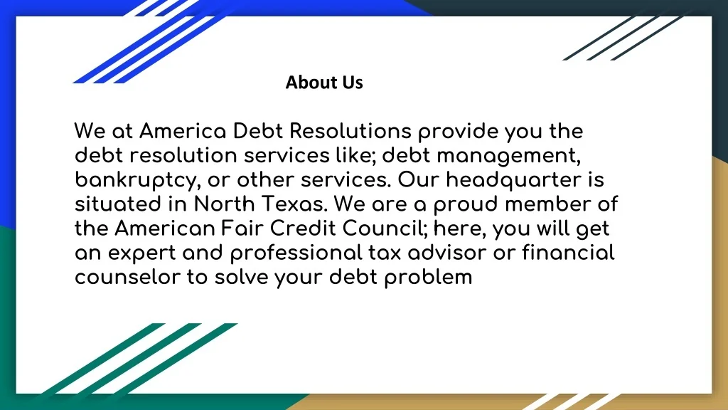 About Us We at America Debt Resolutions provide you the debt resolution services like; debt management, bankruptcy, or other services. Our headquarter is situated in North Texas. We are a proud member of the American Fair Credit Council; here, you will get an expert and professional tax advisor or financial counselor to solve your debt problem