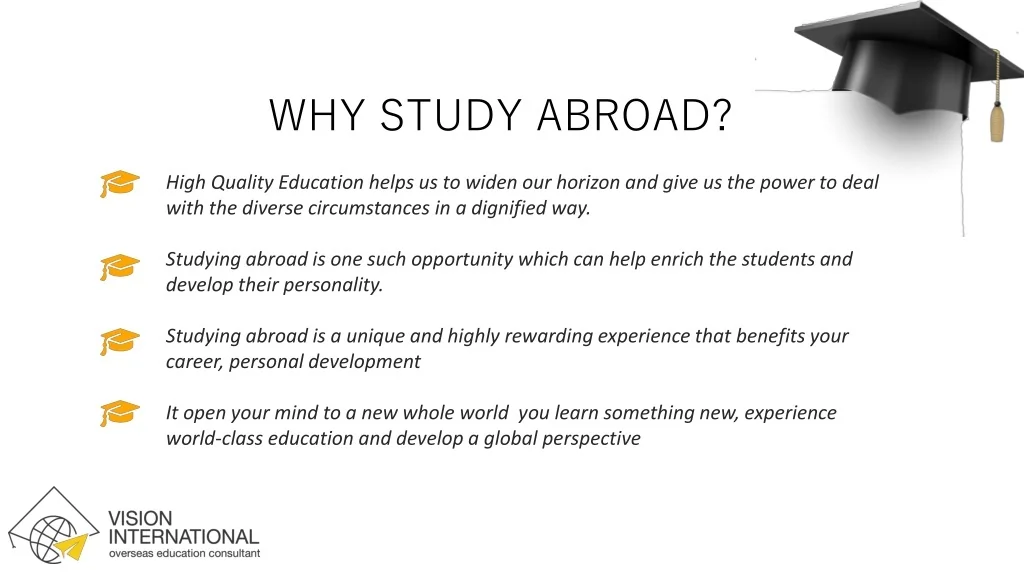 WHY STUDY ABROAD? High Quality Education helps us to widen our horizon and give us the power to deal with the diverse circumstances in a dignified way. Studying abroad is one such opportunity which can help enrich the students and develop their personality. Studying abroad is a unique and highly rewarding experience that benefits your career, personal development It open your mind to a new whole world you learn something new, experience world-class education and develop a global perspective