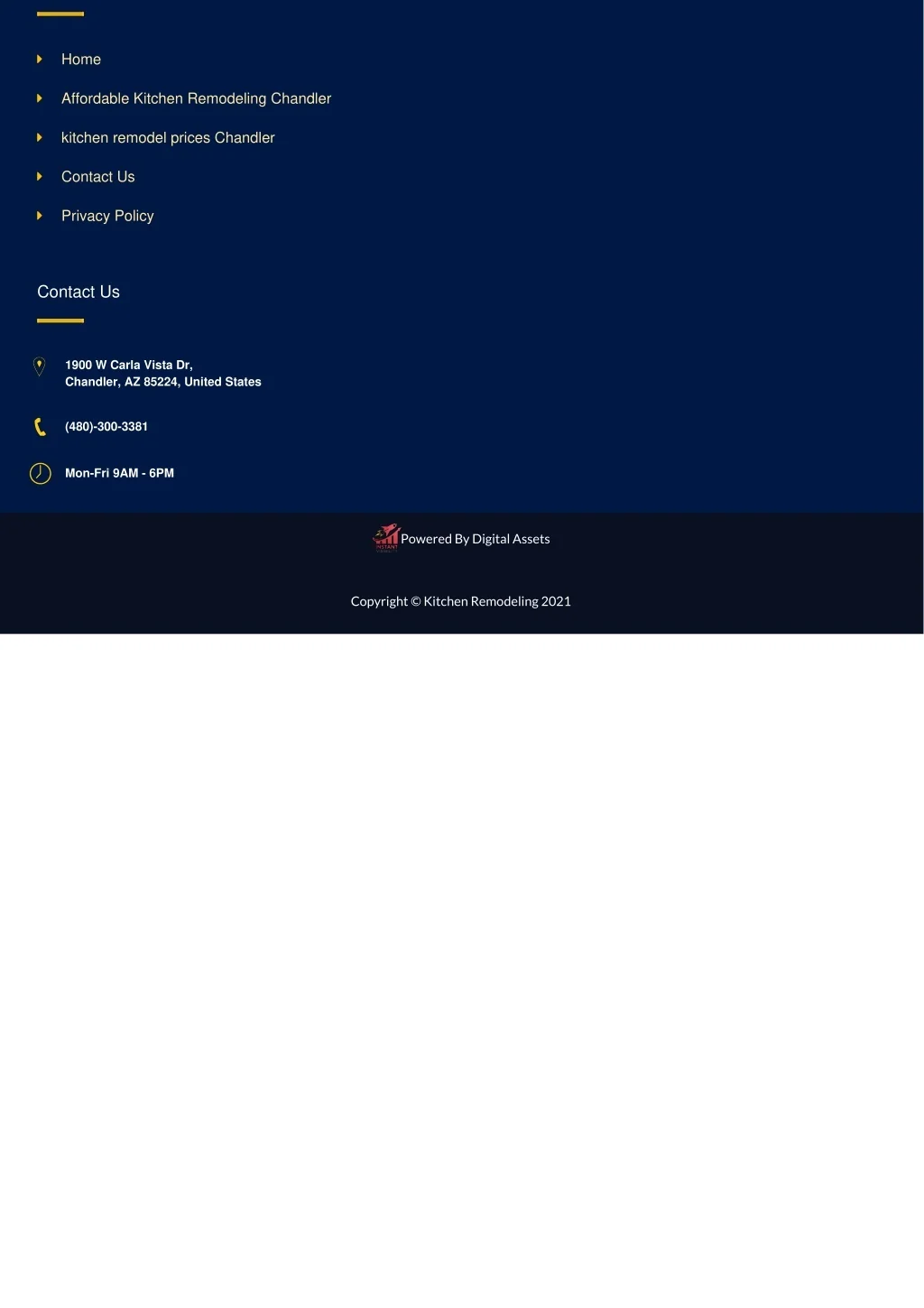 Home Affordable Kitchen Remodeling Chandler kitchen remodel prices Chandler Contact Us Privacy Policy Contact Us 1900 W Carla Vista Dr, Chandler, AZ 85224, United States (480)-300-3381 Mon-Fri 9AM - 6PM Powered By Digital Assets Copyright © Kitchen Remodeling 2021