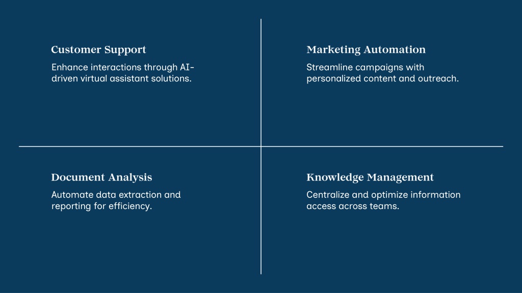 4. Customer Support • Marketing Automation • Document Analysis • Knowledge Management • Enhance interactions through AI-driven virtual assistant solutions. • Streamline campaigns with personalized content and outreach. • Automate data extraction and reporting for efficiency. • Centralize and optimize information access across teams.