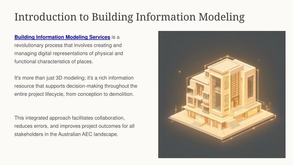 Introduction to Building Information Modeling Building Information Modeling Services is a revolutionary process that involves creating and managing digital representations of physical and functional characteristics of places. It's more than just 3D modeling; it's a rich information resource that supports decision-making throughout the entire project lifecycle, from conception to demolition. This integrated approach facilitates collaboration, reduces errors, and improves project outcomes for all stakeholders in the Australian AEC landscape.