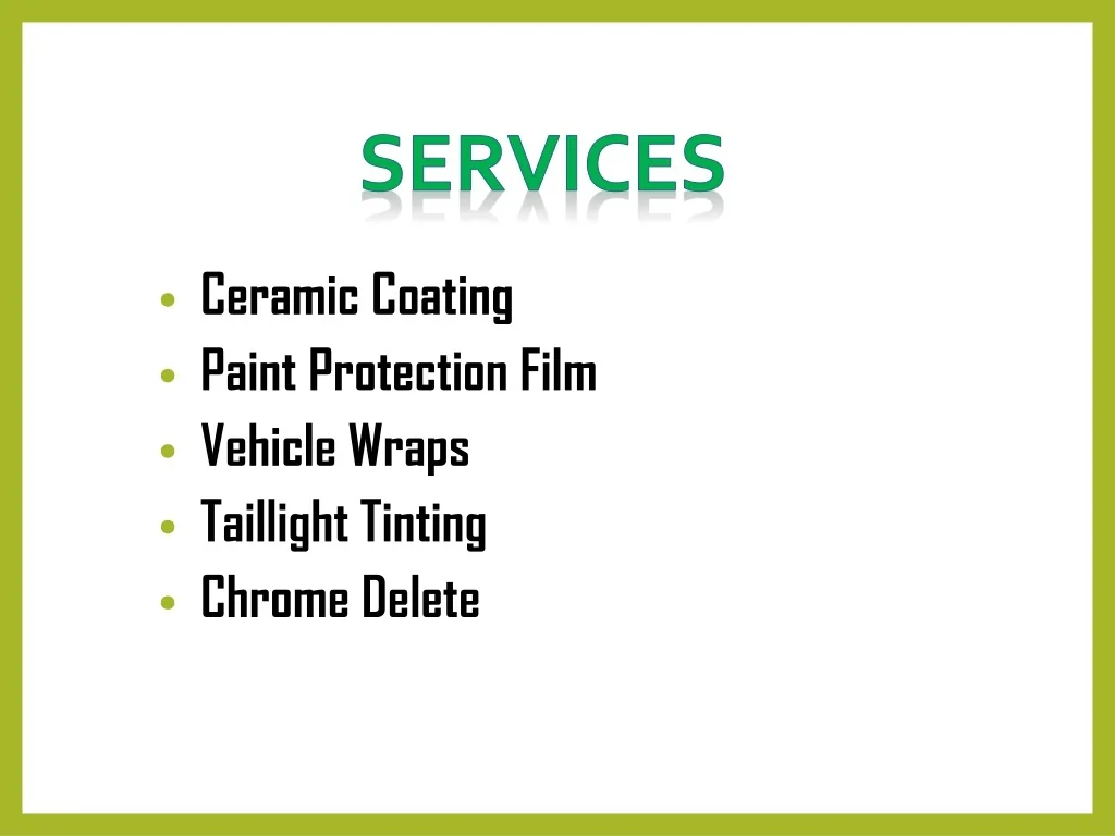 SERVICES • Ceramic Coating • Paint Protection Film • Vehicle Wraps • Taillight Tinting • Chrome Delete