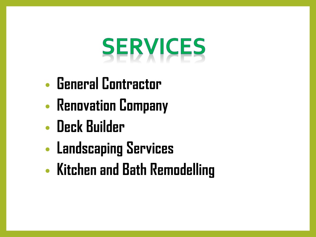 SERVICES • General Contractor • Renovation Company • Deck Builder • Landscaping Services • Kitchen and Bath Remodelling