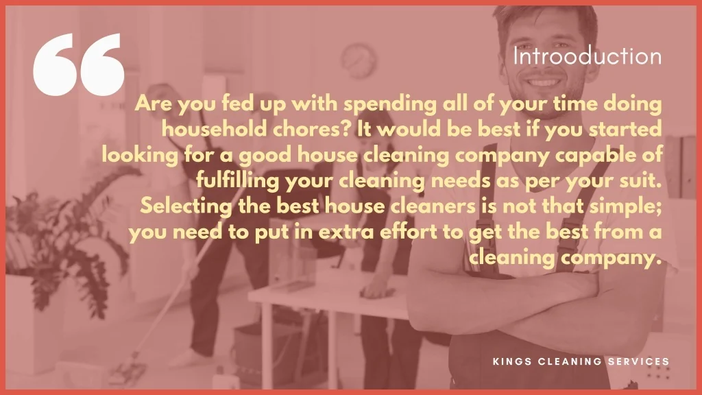 Introoduction Are you fed up with spending all of your time doing household chores? It would be best if you started looking for a good house cleaning company capable of fulfilling your cleaning needs as per your suit. Selecting the best house cleaners is not that simple; you need to put in extra effort to get the best from a cleaning company. K IN G S CL E A N IN G S E RV IC E S