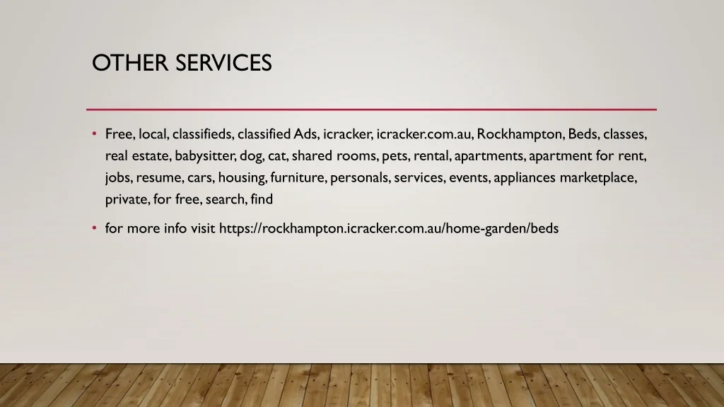 Other services • Free, local, classifieds, classified Ads, icracker, icracker.com.au, Rockhampton, Beds, classes, real estate, babysitter, dog, cat, shared rooms, pets, rental, apartments, apartment for rent, jobs, resume, cars, housing, furniture, personals, services, events, appliances marketplace, private, for free, search, find • for more info visit https://rockhampton.icracker.com.au/home-garden/beds