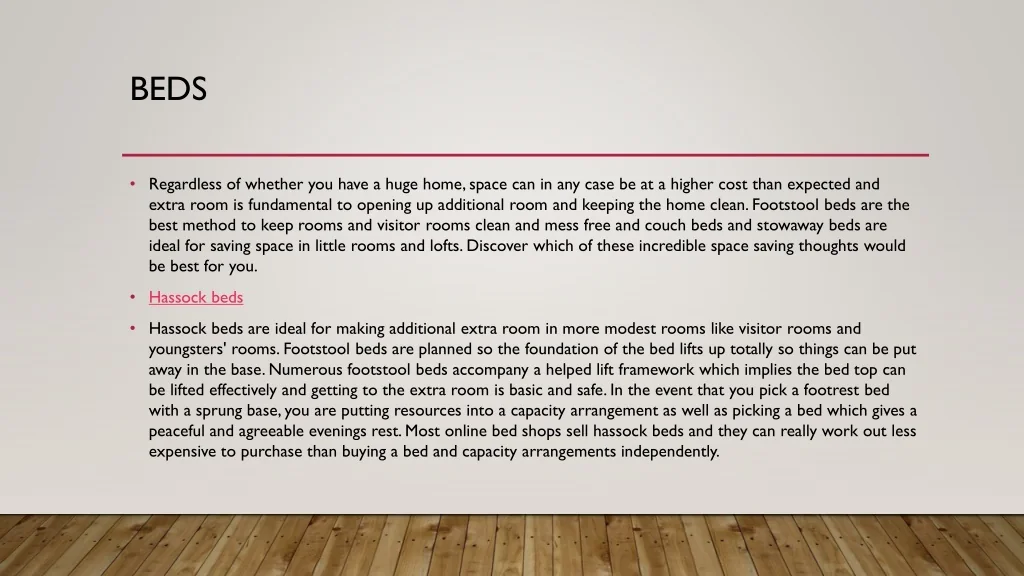 Beds • Regardless of whether you have a huge home, space can in any case be at a higher cost than expected and extra room is fundamental to opening up additional room and keeping the home clean. Footstool beds are the best method to keep rooms and visitor rooms clean and mess free and couch beds and stowaway beds are ideal for saving space in little rooms and lofts. Discover which of these incredible space saving thoughts would be best for you. • Hassock beds • Hassock beds are ideal for making additional extra room in more modest rooms like visitor rooms and youngsters' rooms. Footstool beds are planned so the foundation of the bed lifts up totally so things can be put away in the base. Numerous footstool beds accompany a helped lift framework which implies the bed top can be lifted effectively and getting to the extra room is basic and safe. In the event that you pick a footrest bed with a sprung base, you are putting resources into a capacity arrangement as well as picking a bed which gives a peaceful and agreeable evenings rest. Most online bed shops sell hassock beds and they can really work out less expensive to purchase than buying a bed and capacity arrangements independently.