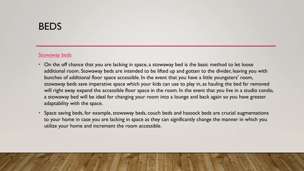 Beds Stowaway beds • On the off chance that you are lacking in space, a stowaway bed is the basic method to let loose additional room. Stowaway beds are intended to be lifted up and gotten to the divider, leaving you with bunches of additional floor space accessible. In the event that you have a little youngsters' room, stowaway beds save imperative space which your kids can use to play in, as hauling the bed far removed will right away expand the accessible floor space in the room. In the event that you live in a studio condo, a stowaway bed will be ideal for changing your room into a lounge and back again so you have greater adaptability with the space. • Space saving beds, for example, stowaway beds, couch beds and hassock beds are crucial augmentations to your home in case you are lacking in space as they can significantly change the manner in which you utilize your home and increment the room accessible.