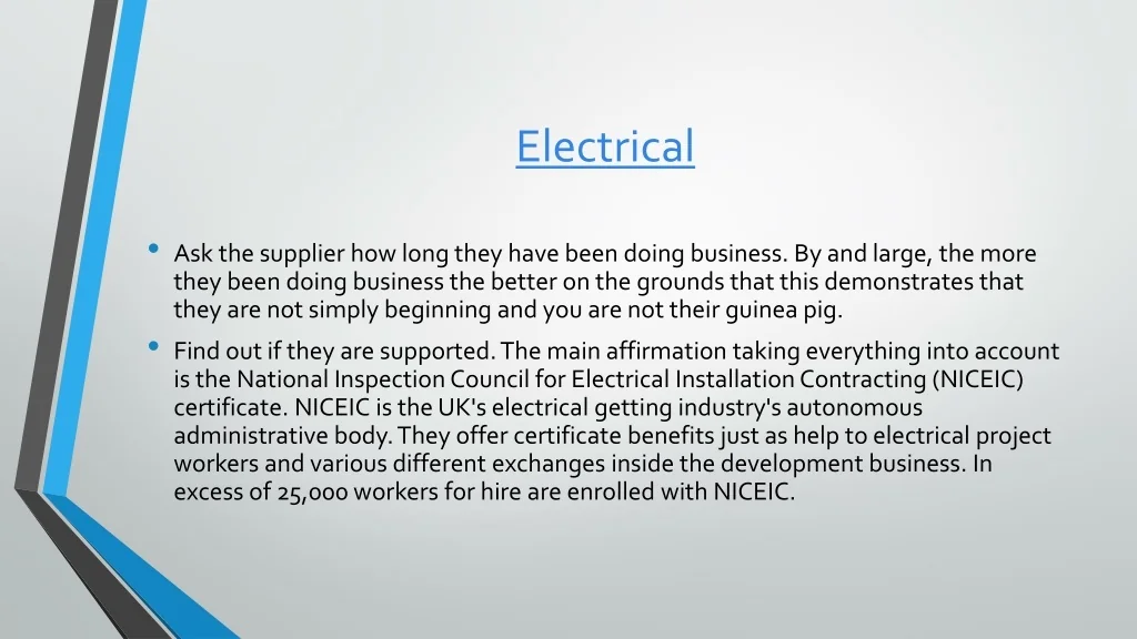 Electrical Ask the supplier how long they have been doing business. By and large, the more they been doing business the better on the grounds that this demonstrates that they are not simply beginning and you are not their guinea pig. Find out if they are supported. The main affirmation taking everything into account is the National Inspection Council for Electrical Installation Contracting (NICEIC) certificate. NICEIC is the UK's electrical getting industry's autonomous administrative body. They offer certificate benefits just as help to electrical project workers and various different exchanges inside the development business. In excess of 25,000 workers for hire are enrolled with NICEIC.
