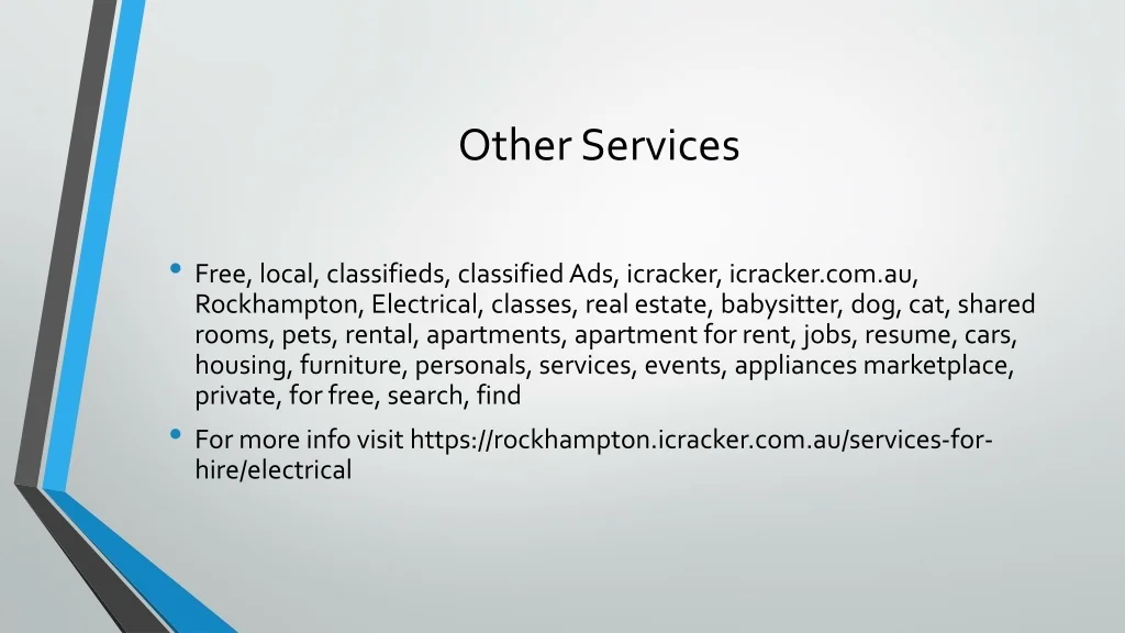Other Services Free, local, classifieds, classified Ads, icracker, icracker.com.au, Rockhampton, Electrical, classes, real estate, babysitter, dog, cat, shared rooms, pets, rental, apartments, apartment for rent, jobs, resume, cars, housing, furniture, personals, services, events, appliances marketplace, private, for free, search, find For more info visit https://rockhampton.icracker.com.au/services-for-hire/electrical