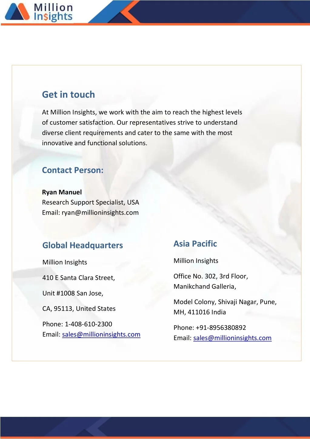 Get in touch At Million Insights, we work with the aim to reach the highest levels of customer satisfaction. Our representatives strive to understand diverse client requirements and cater to the same with the most innovative and functional solutions. Contact Person: Ryan Manuel Research Support Specialist, USA Email: ryan@millioninsights.com Asia Pacific Global Headquarters Million Insights Million Insights Office No. 302, 3rd Floor, Manikchand Galleria, 410 E Santa Clara Street, Unit #1008 San Jose, Model Colony, Shivaji Nagar, Pune, MH, 411016 India CA, 95113, United States Phone: 1-408-610-2300 Email: sales@millioninsights.com Phone: +91-8956380892 Email: sales@millioninsights.com