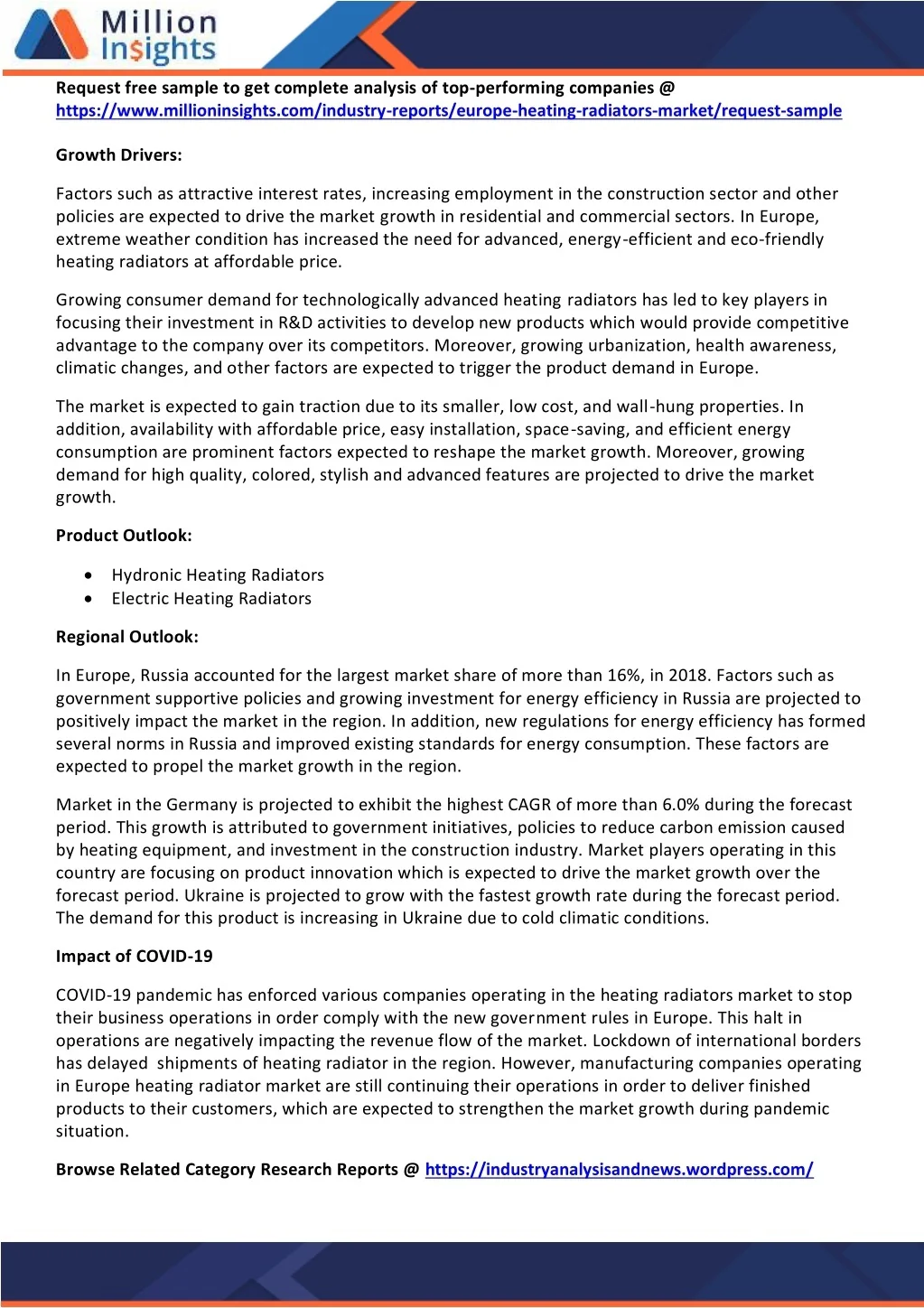 https://www.millioninsights.com/industry-reports/europe-heating-radiators-market/request-samplehttps://www.millioninsights.com/industry-reports/europe-heating-radiators-market/request-sample Factors such as attractive interest rates, increasing employment in the construction sector and other policies are expected to drive the market growth in residential and commercial sectors. In Europe, extreme weather condition has increased the need for advanced, energy-efficient and eco-friendly heating radiators at affordable price. Request free sample to get complete analysis of top-performing companies @ Growth Drivers: Growing consumer demand for technologically advanced heating radiators has led to key players in focusing their investment in R&D activities to develop new products which would provide competitive advantage to the company over its competitors. Moreover, growing urbanization, health awareness, climatic changes, and other factors are expected to trigger the product demand in Europe. The market is expected to gain traction due to its smaller, low cost, and wall-hung properties. In addition, availability with affordable price, easy installation, space-saving, and efficient energy consumption are prominent factors expected to reshape the market growth. Moreover, growing demand for high quality, colored, stylish and advanced features are projected to drive the market growth. Product Outlook: Hydronic Heating Radiators Electric Heating Radiators Regional Outlook: In Europe, Russia accounted for the largest market share of more than 16%, in 2018. Factors such as government supportive policies and growing investment for energy efficiency in Russia are projected to positively impact the market in the region. In addition, new regulations for energy efficiency has formed several norms in Russia and improved existing standards for energy consumption. These factors are expected to propel the market growth in the region. Market in the Germany is projected to exhibit the highest CAGR of more than 6.0% during the forecast period. This growth is attributed to government initiatives, policies to reduce carbon emission caused by heating equipment, and investment in the construction industry. Market players operating in this country are focusing on product innovation which is expected to drive the market growth over the forecast period. Ukraine is projected to grow with the fastest growth rate during the forecast period. The demand for this product is increasing in Ukraine due to cold climatic conditions. Impact of COVID-19 COVID-19 pandemic has enforced various companies operating in the heating radiators market to stop their business operations in order comply with the new government rules in Europe. This halt in operations are negatively impacting the revenue flow of the market. Lockdown of international borders has delayed shipments of heating radiator in the region. However, manufacturing companies operating in Europe heating radiator market are still continuing their operations in order to deliver finished products to their customers, which are expected to strengthen the market growth during pandemic situation. Browse Related Category Research Reports @ https://industryanalysisandnews.wordpress.com/