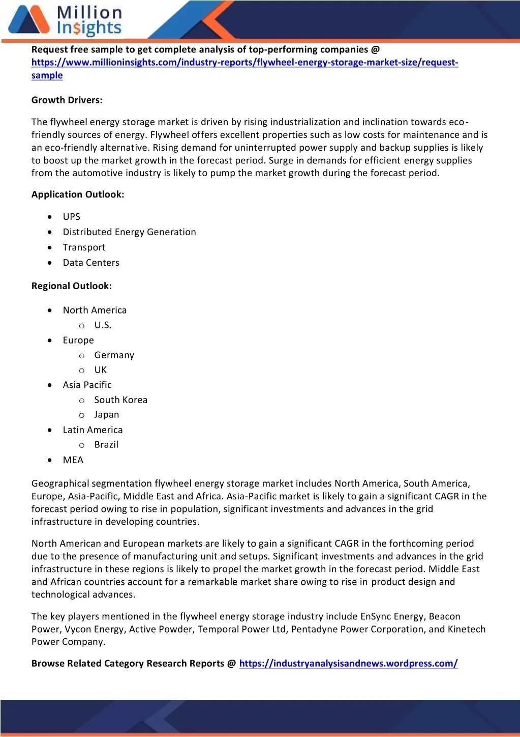 Request free sample to get complete analysis of top-performing companies @ https://www.millioninsights.com/industry-reports/flywheel-energy-storage-market-size/request- sample Growth Drivers: The flywheel energy storage market is driven by rising industrialization and inclination towards eco- friendly sources of energy. Flywheel offers excellent properties such as low costs for maintenance and is an eco-friendly alternative. Rising demand for uninterrupted power supply and backup supplies is likely to boost up the market growth in the forecast period. Surge in demands for efficient energy supplies from the automotive industry is likely to pump the market growth during the forecast period. Application Outlook: UPS Distributed Energy Generation Transport Data Centers Regional Outlook: North America oU.S. Europe oGermany oUK Asia Pacific oSouth Korea oJapan Latin America oBrazil MEA Geographical segmentation flywheel energy storage market includes North America, South America, Europe, Asia-Pacific, Middle East and Africa. Asia-Pacific market is likely to gain a significant CAGR in the forecast period owing to rise in population, significant investments and advances in the grid infrastructure in developing countries. North American and European markets are likely to gain a significant CAGR in the forthcoming period due to the presence of manufacturing unit and setups. Significant investments and advances in the grid infrastructure in these regions is likely to propel the market growth in the forecast period. Middle East and African countries account for a remarkable market share owing to rise in product design and technological advances. The key players mentioned in the flywheel energy storage industry include EnSync Energy, Beacon Power, Vycon Energy, Active Powder, Temporal Power Ltd, Pentadyne Power Corporation, and Kinetech Power Company. Browse Related Category Research Reports @ https://industryanalysisandnews.wordpress.com/
