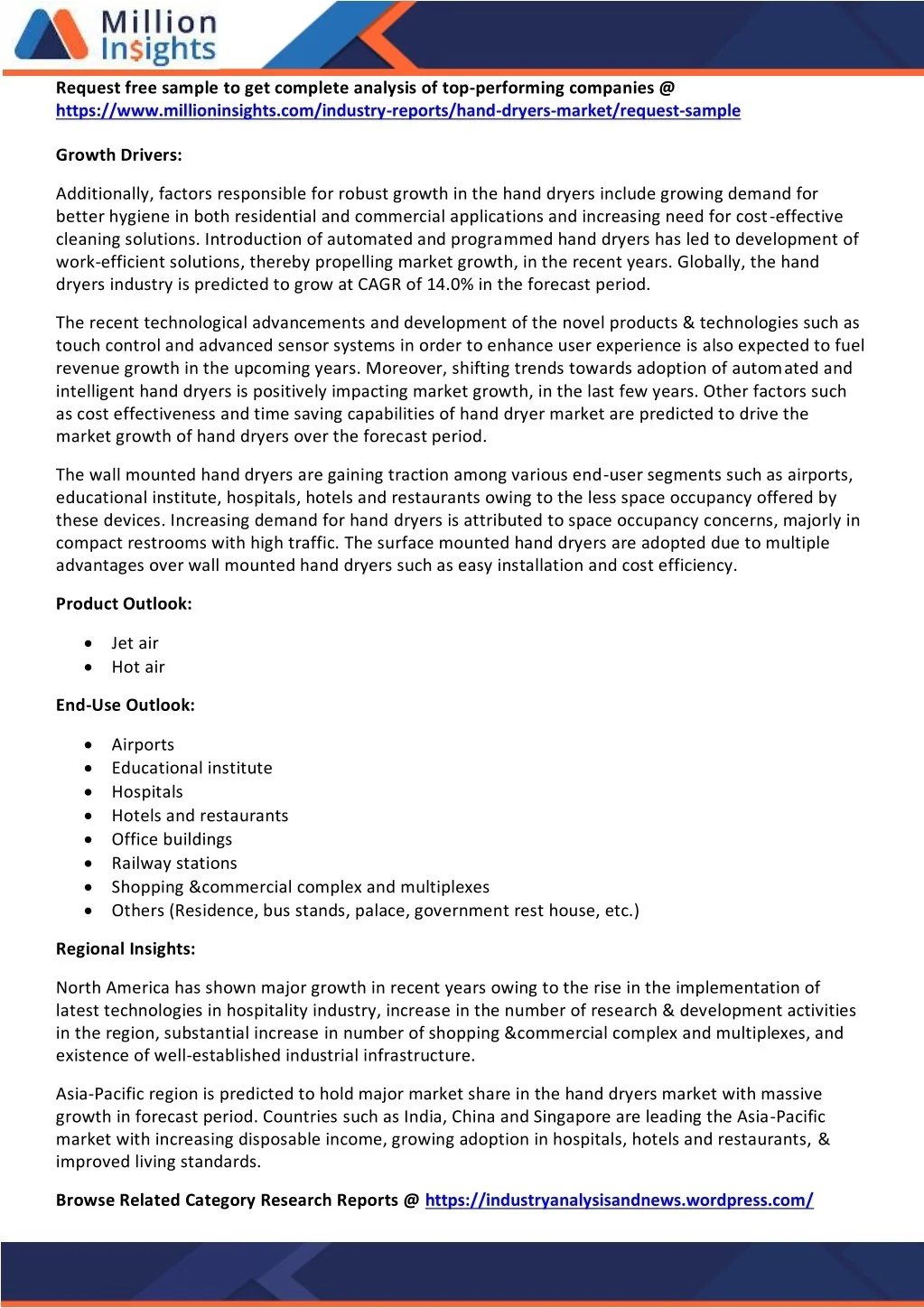 https://www.millioninsights.com/industry-reports/hand-dryers-market/request-samplehttps://www.millioninsights.com/industry-reports/hand-dryers-market/request-sample dryers industry is predicted to grow at CAGR of 14.0% in the forecast period. Request free sample to get complete analysis of top-performing companies @ Growth Drivers: Additionally, factors responsible for robust growth in the hand dryers include growing demand for better hygiene in both residential and commercial applications and increasing need for cost-effective cleaning solutions. Introduction of automated and programmed hand dryers has led to development of work-efficient solutions, thereby propelling market growth, in the recent years. Globally, the hand The recent technological advancements and development of the novel products & technologies such as touch control and advanced sensor systems in order to enhance user experience is also expected to fuel revenue growth in the upcoming years. Moreover, shifting trends towards adoption of automated and intelligent hand dryers is positively impacting market growth, in the last few years. Other factors such as cost effectiveness and time saving capabilities of hand dryer market are predicted to drive the market growth of hand dryers over the forecast period. The wall mounted hand dryers are gaining traction among various end-user segments such as airports, educational institute, hospitals, hotels and restaurants owing to the less space occupancy offered by these devices. Increasing demand for hand dryers is attributed to space occupancy concerns, majorly in compact restrooms with high traffic. The surface mounted hand dryers are adopted due to multiple advantages over wall mounted hand dryers such as easy installation and cost efficiency. Product Outlook: Jet air Hot air End-Use Outlook: Airports Educational institute Hospitals Hotels and restaurants Office buildings Railway stations Shopping &commercial complex and multiplexes Others (Residence, bus stands, palace, government rest house, etc.) Regional Insights: North America has shown major growth in recent years owing to the rise in the implementation of latest technologies in hospitality industry, increase in the number of research & development activities in the region, substantial increase in number of shopping &commercial complex and multiplexes, and existence of well-established industrial infrastructure. Asia-Pacific region is predicted to hold major market share in the hand dryers market with massive growth in forecast period. Countries such as India, China and Singapore are leading the Asia-Pacific market with increasing disposable income, growing adoption in hospitals, hotels and restaurants, & improved living standards. Browse Related Category Research Reports @ https://industryanalysisandnews.wordpress.com/