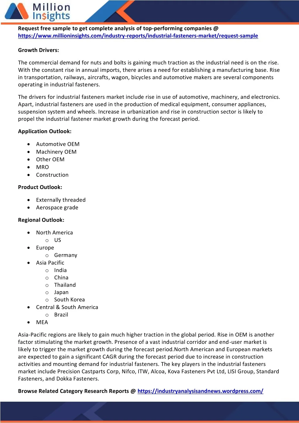 https://www.millioninsights.com/industry-reports/industrial-fasteners-market/request-samplehttps://www.millioninsights.com/industry-reports/industrial-fasteners-market/request-sample Growth Drivers: Request free sample to get complete analysis of top-performing companies @ The commercial demand for nuts and bolts is gaining much traction as the industrial need is on the rise. With the constant rise in annual imports, there arises a need for establishing a manufacturing base. Rise in transportation, railways, aircrafts, wagon, bicycles and automotive makers are several components operating in industrial fasteners. The drivers for industrial fasteners market include rise in use of automotive, machinery, and electronics. Apart, industrial fasteners are used in the production of medical equipment, consumer appliances, suspension system and wheels. Increase in urbanization and rise in construction sector is likely to propel the industrial fastener market growth during the forecast period. Application Outlook: Automotive OEM Machinery OEM Other OEM MRO Construction Product Outlook: Externally threaded Aerospace grade Regional Outlook: North America oUS Europe oGermany Asia Pacific oIndia oChina oThailand oJapan oSouth Korea Central & South America oBrazil MEA Asia-Pacific regions are likely to gain much higher traction in the global period. Rise in OEM is another factor stimulating the market growth. Presence of a vast industrial corridor and end-user market is likely to trigger the market growth during the forecast period.North American and European markets are expected to gain a significant CAGR during the forecast period due to increase in construction activities and mounting demand for industrial fasteners. The key players in the industrial fasteners market include Precision Castparts Corp, Nifco, ITW, Alcoa, Kova Fasteners Pvt Ltd, LISI Group, Standard Fasteners, and Dokka Fasteners. Browse Related Category Research Reports @ https://industryanalysisandnews.wordpress.com/