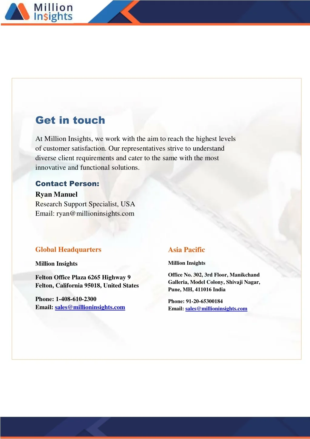 Get in touch At Million Insights, we work with the aim to reach the highest levels of customer satisfaction. Our representatives strive to understand diverse client requirements and cater to the same with the most innovative and functional solutions. Contact Person: Ryan Manuel Research Support Specialist, USA Email: ryan@millioninsights.com Asia Pacific Global Headquarters Million Insights Million Insights Office No. 302, 3rd Floor, Manikchand Galleria, Model Colony, Shivaji Nagar, Pune, MH, 411016 India Felton Office Plaza 6265 Highway 9 Felton, California 95018, United States Phone: 1-408-610-2300 Email: sales@millioninsights.com Phone: 91-20-65300184 Email: sales@millioninsights.com