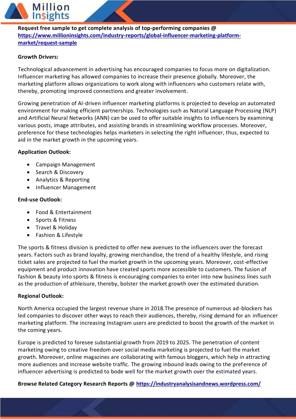 Request free sample to get complete analysis of top-performing companies @ https://www.millioninsights.com/industry-reports/global-influencer-marketing-platform- market/request-sample Growth Drivers: Technological advancement in advertising has encouraged companies to focus more on digitalization. Influencer marketing has allowed companies to increase their presence globally. Moreover, the marketing platform allows organizations to work along with influencers who customers relate with, thereby, promoting improved connections and greater involvement. Growing penetration of AI-driven influencer marketing platforms is projected to develop an automated environment for making efficient partnerships. Technologies such as Natural Language Processing (NLP) and Artificial Neural Networks (ANN) can be used to offer suitable insights to influencers by examining various posts, image attributes, and assisting brands in streamlining workflow processes. Moreover, preference for these technologies helps marketers in selecting the right influencer, thus, expected to aid in the market growth in the upcoming years. Application Outlook: Campaign Management Search & Discovery Analytics & Reporting Influencer Management End-use Outlook: Food & Entertainment Sports & Fitness Travel & Holiday Fashion & Lifestyle The sports & fitness division is predicted to offer new avenues to the influencers over the forecast years. Factors such as brand loyalty, growing merchandise, the trend of a healthy lifestyle, and rising ticket sales are projected to fuel the market growth in the upcoming years. Moreover, cost-effective equipment and product innovation have created sports more accessible to customers. The fusion of fashion & beauty into sports & fitness is encouraging companies to enter into new business lines such as the production of athleisure, thereby, bolster the market growth over the estimated duration. Regional Outlook: North America occupied the largest revenue share in 2018.The presence of numerous ad-blockers has led companies to discover other ways to reach their audiences, thereby, rising demand for an influencer marketing platform. The increasing Instagram users are predicted to boost the growth of the market in the coming years. Europe is predicted to foresee substantial growth from 2019 to 2025. The penetration of content marketing owing to creative freedom over social media marketing is projected to fuel the market growth. Moreover, online magazines are collaborating with famous bloggers, which help in attracting more audiences and increase website traffic. The growing inbound leads owing to the preference of influencer advertising is predicted to bode well for the market growth over the estimated years. Browse Related Category Research Reports @ https://industryanalysisandnews.wordpress.com/
