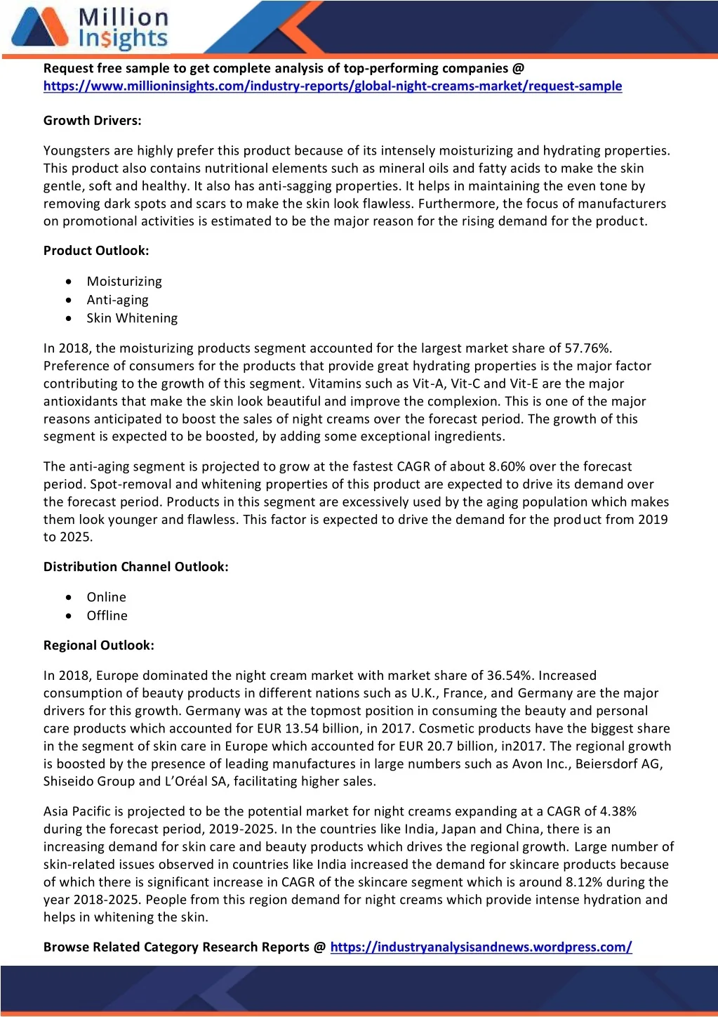https://www.millioninsights.com/industry-reports/global-night-creams-market/request-samplehttps://www.millioninsights.com/industry-reports/global-night-creams-market/request-sample This product also contains nutritional elements such as mineral oils and fatty acids to make the skin gentle, soft and healthy. It also has anti-sagging properties. It helps in maintaining the even tone by removing dark spots and scars to make the skin look flawless. Furthermore, the focus of manufacturers on promotional activities is estimated to be the major reason for the rising demand for the product. Request free sample to get complete analysis of top-performing companies @ Growth Drivers: Youngsters are highly prefer this product because of its intensely moisturizing and hydrating properties. Product Outlook: Moisturizing Anti-aging Skin Whitening In 2018, the moisturizing products segment accounted for the largest market share of 57.76%. Preference of consumers for the products that provide great hydrating properties is the major factor contributing to the growth of this segment. Vitamins such as Vit-A, Vit-C and Vit-E are the major antioxidants that make the skin look beautiful and improve the complexion. This is one of the major reasons anticipated to boost the sales of night creams over the forecast period. The growth of this segment is expected to be boosted, by adding some exceptional ingredients. The anti-aging segment is projected to grow at the fastest CAGR of about 8.60% over the forecast period. Spot-removal and whitening properties of this product are expected to drive its demand over the forecast period. Products in this segment are excessively used by the aging population which makes them look younger and flawless. This factor is expected to drive the demand for the product from 2019 to 2025. Distribution Channel Outlook: Online Offline Regional Outlook: In 2018, Europe dominated the night cream market with market share of 36.54%. Increased consumption of beauty products in different nations such as U.K., France, and Germany are the major drivers for this growth. Germany was at the topmost position in consuming the beauty and personal care products which accounted for EUR 13.54 billion, in 2017. Cosmetic products have the biggest share in the segment of skin care in Europe which accounted for EUR 20.7 billion, in2017. The regional growth is boosted by the presence of leading manufactures in large numbers such as Avon Inc., Beiersdorf AG, Shiseido Group and L’Oréal SA, facilitating higher sales. Asia Pacific is projected to be the potential market for night creams expanding at a CAGR of 4.38% during the forecast period, 2019-2025. In the countries like India, Japan and China, there is an increasing demand for skin care and beauty products which drives the regional growth. Large number of skin-related issues observed in countries like India increased the demand for skincare products because of which there is significant increase in CAGR of the skincare segment which is around 8.12% during the year 2018-2025. People from this region demand for night creams which provide intense hydration and helps in whitening the skin. Browse Related Category Research Reports @ https://industryanalysisandnews.wordpress.com/