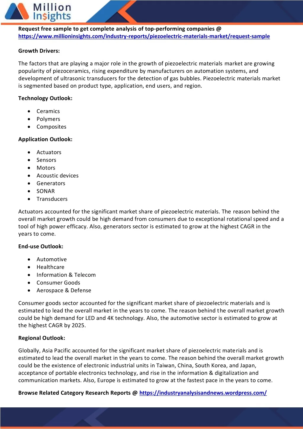 https://www.millioninsights.com/industry-reports/piezoelectric-materials-market/request-samplehttps://www.millioninsights.com/industry-reports/piezoelectric-materials-market/request-sample Growth Drivers: Request free sample to get complete analysis of top-performing companies @ The factors that are playing a major role in the growth of piezoelectric materials market are growing popularity of piezoceramics, rising expenditure by manufacturers on automation systems, and development of ultrasonic transducers for the detection of gas bubbles. Piezoelectric materials market is segmented based on product type, application, end users, and region. Technology Outlook: Ceramics Polymers Composites Application Outlook: Actuators Sensors Motors Acoustic devices Generators SONAR Transducers Actuators accounted for the significant market share of piezoelectric materials. The reason behind the overall market growth could be high demand from consumers due to exceptional rotational speed and a tool of high power efficacy. Also, generators sector is estimated to grow at the highest CAGR in the years to come. End-use Outlook: Automotive Healthcare Information & Telecom Consumer Goods Aerospace & Defense Consumer goods sector accounted for the significant market share of piezoelectric materials and is estimated to lead the overall market in the years to come. The reason behind the overall market growth could be high demand for LED and 4K technology. Also, the automotive sector is estimated to grow at the highest CAGR by 2025. Regional Outlook: Globally, Asia Pacific accounted for the significant market share of piezoelectric materials and is estimated to lead the overall market in the years to come. The reason behind the overall market growth could be the existence of electronic industrial units in Taiwan, China, South Korea, and Japan, acceptance of portable electronics technology, and rise in the information & digitalization and communication markets. Also, Europe is estimated to grow at the fastest pace in the years to come. Browse Related Category Research Reports @ https://industryanalysisandnews.wordpress.com/