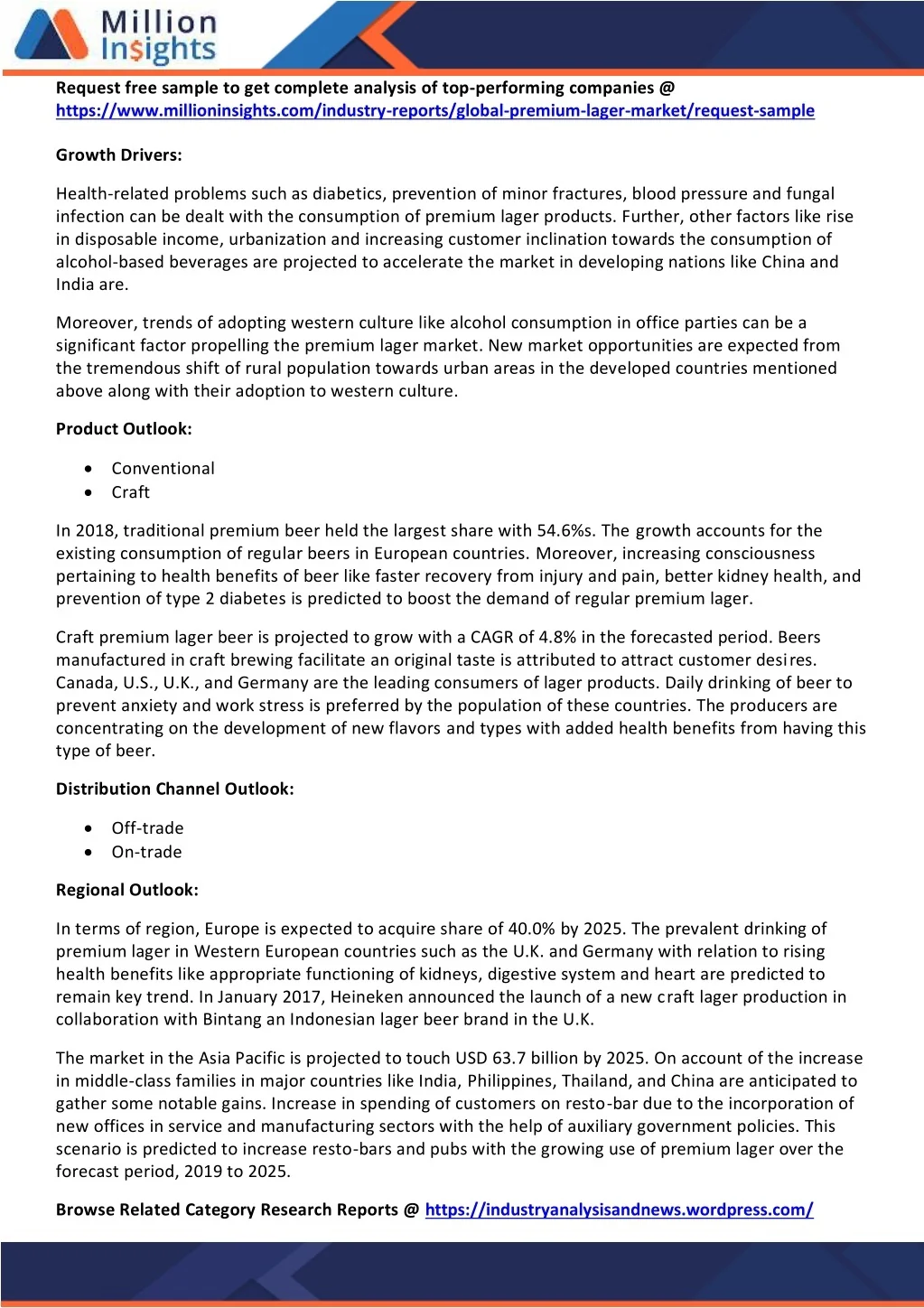 https://www.millioninsights.com/industry-reports/global-premium-lager-market/request-samplehttps://www.millioninsights.com/industry-reports/global-premium-lager-market/request-sample in disposable income, urbanization and increasing customer inclination towards the consumption of alcohol-based beverages are projected to accelerate the market in developing nations like China and India are. Request free sample to get complete analysis of top-performing companies @ Growth Drivers: Health-related problems such as diabetics, prevention of minor fractures, blood pressure and fungal infection can be dealt with the consumption of premium lager products. Further, other factors like rise Moreover, trends of adopting western culture like alcohol consumption in office parties can be a significant factor propelling the premium lager market. New market opportunities are expected from the tremendous shift of rural population towards urban areas in the developed countries mentioned above along with their adoption to western culture. Product Outlook: Conventional Craft In 2018, traditional premium beer held the largest share with 54.6%s. The growth accounts for the existing consumption of regular beers in European countries. Moreover, increasing consciousness pertaining to health benefits of beer like faster recovery from injury and pain, better kidney health, and prevention of type 2 diabetes is predicted to boost the demand of regular premium lager. Craft premium lager beer is projected to grow with a CAGR of 4.8% in the forecasted period. Beers manufactured in craft brewing facilitate an original taste is attributed to attract customer desires. Canada, U.S., U.K., and Germany are the leading consumers of lager products. Daily drinking of beer to prevent anxiety and work stress is preferred by the population of these countries. The producers are concentrating on the development of new flavors and types with added health benefits from having this type of beer. Distribution Channel Outlook: Off-trade On-trade Regional Outlook: In terms of region, Europe is expected to acquire share of 40.0% by 2025. The prevalent drinking of premium lager in Western European countries such as the U.K. and Germany with relation to rising health benefits like appropriate functioning of kidneys, digestive system and heart are predicted to remain key trend. In January 2017, Heineken announced the launch of a new craft lager production in collaboration with Bintang an Indonesian lager beer brand in the U.K. The market in the Asia Pacific is projected to touch USD 63.7 billion by 2025. On account of the increase in middle-class families in major countries like India, Philippines, Thailand, and China are anticipated to gather some notable gains. Increase in spending of customers on resto-bar due to the incorporation of new offices in service and manufacturing sectors with the help of auxiliary government policies. This scenario is predicted to increase resto-bars and pubs with the growing use of premium lager over the forecast period, 2019 to 2025. Browse Related Category Research Reports @ https://industryanalysisandnews.wordpress.com/