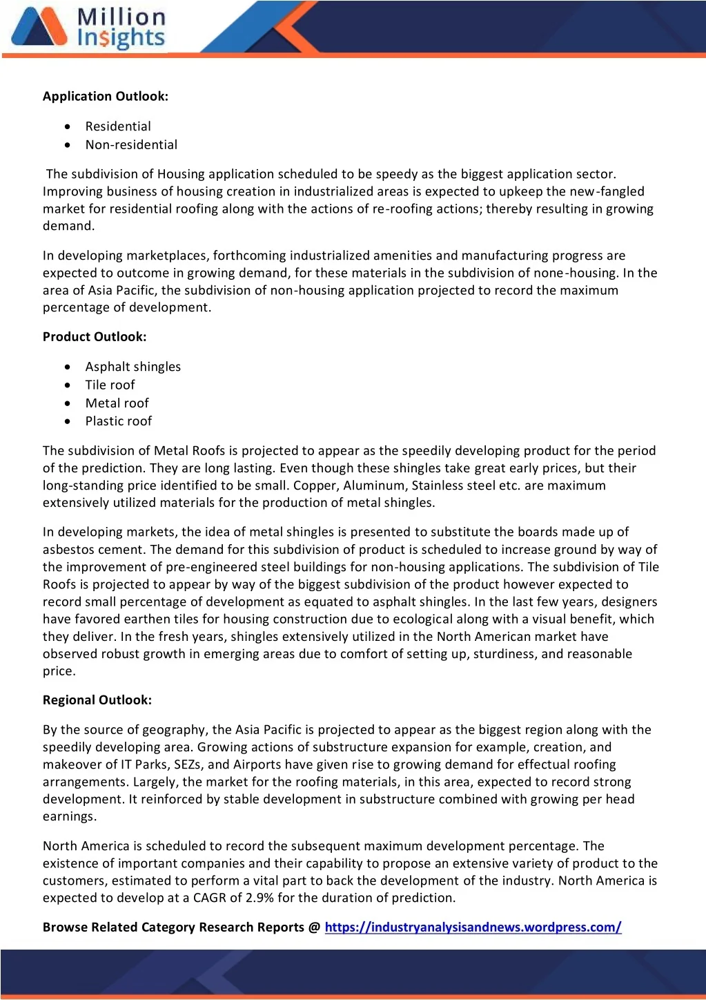 Roofing Materials Market Revenue Drivers, Growth Opportunities, Value Chain Analysis and Forecast Research Report Till 2025 “The global Roofing Materials market is estimated to develop at a CAGR of 3.1% for the duration of the prediction as the scope and its applications are rising enormously across the globe.” The global Roofing Materials Market research report provides complete insights on industry scope, trends, regional estimates, key application, competitive landscape and financial performance of prominent players. It also offers ready data-driven answers to several industry-level questions. This study enables numerous opportunities for the market players to invest in research and development. Market Overview: The global Roofing Materials market is estimated to develop at a CAGR of 3.1% for the duration of the prediction. The demand for the roofing material is estimated to be powered by increasing construction actions of housing building in industrialized nations, similar to the U.S.A., these are projected to record an optimistic development percentage. Key Players: https://www.millioninsights.com/industry-reports/roofing-materials-market/request-sample GAF Materials Corporation Atlas Roofing Corporation CertainTeed Corporation Owens Corning Corp. Braas Monier Building Group Etex Fletcher Building Limited TAMKO Building Products, Inc. IcoPal ApS. North American Roofing Request free sample to get complete analysis of top-performing companies @