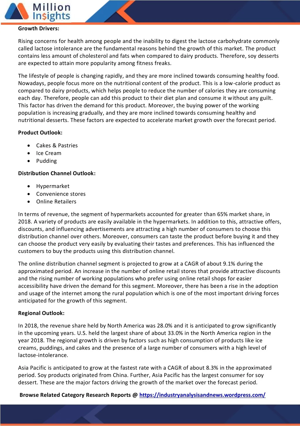 Growth Drivers: Rising concerns for health among people and the inability to digest the lactose carbohydrate commonly called lactose intolerance are the fundamental reasons behind the growth of this market. The product contains less amount of cholesterol and fats when compared to dairy products. Therefore, soy desserts are expected to attain more popularity among fitness freaks. The lifestyle of people is changing rapidly, and they are more inclined towards consuming healthy food. Nowadays, people focus more on the nutritional content of the product. This is a low-calorie product as compared to dairy products, which helps people to reduce the number of calories they are consuming each day. Therefore, people can add this product to their diet plan and consume it without any guilt. This factor has driven the demand for this product. Moreover, the buying power of the working population is increasing gradually, and they are more inclined towards consuming healthy and nutritional desserts. These factors are expected to accelerate market growth over the forecast period. Product Outlook: Cakes & Pastries Ice Cream Pudding Distribution Channel Outlook: Hypermarket Convenience stores Online Retailers In terms of revenue, the segment of hypermarkets accounted for greater than 65% market share, in 2018. A variety of products are easily available in the hypermarkets. In addition to this, attractive offers, discounts, and influencing advertisements are attracting a high number of consumers to choose this distribution channel over others. Moreover, consumers can taste the product before buying it and they can choose the product very easily by evaluating their tastes and preferences. This has influenced the customers to buy the products using this distribution channel. The online distribution channel segment is projected to grow at a CAGR of about 9.1% during the approximated period. An increase in the number of online retail stores that provide attractive discounts and the rising number of working populations who prefer using online retail shops for easier accessibility have driven the demand for this segment. Moreover, there has been a rise in the adoption and usage of the internet among the rural population which is one of the most important driving forces anticipated for the growth of this segment. Regional Outlook: In 2018, the revenue share held by North America was 28.0% and it is anticipated to grow significantly in the upcoming years. U.S. held the largest share of about 33.0% in the North America region in the year 2018. The regional growth is driven by factors such as high consumption of products like ice creams, puddings, and cakes and the presence of a large number of consumers with a high level of lactose-intolerance. Asia Pacific is anticipated to grow at the fastest rate with a CAGR of about 8.3% in the approximated period. Soy products originated from China. Further, Asia Pacific has the largest consumer for soy dessert. These are the major factors driving the growth of the market over the forecast period. Browse Related Category Research Reports @ https://industryanalysisandnews.wordpress.com/