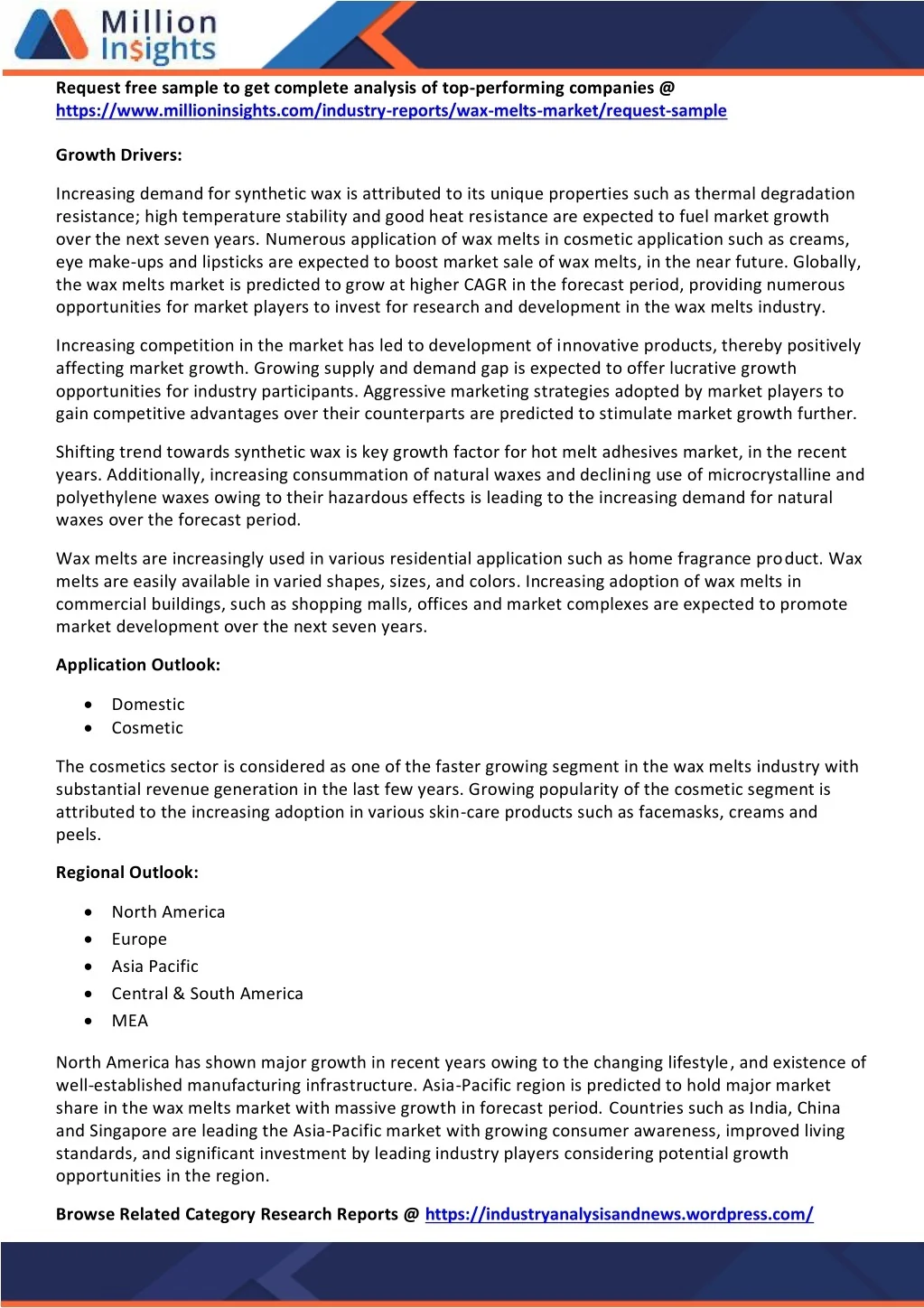 https://www.millioninsights.com/industry-reports/wax-melts-market/request-samplehttps://www.millioninsights.com/industry-reports/wax-melts-market/request-sample Increasing demand for synthetic wax is attributed to its unique properties such as thermal degradation resistance; high temperature stability and good heat resistance are expected to fuel market growth over the next seven years. Numerous application of wax melts in cosmetic application such as creams, eye make-ups and lipsticks are expected to boost market sale of wax melts, in the near future. Globally, the wax melts market is predicted to grow at higher CAGR in the forecast period, providing numerous opportunities for market players to invest for research and development in the wax melts industry. Request free sample to get complete analysis of top-performing companies @ Growth Drivers: Increasing competition in the market has led to development of innovative products, thereby positively affecting market growth. Growing supply and demand gap is expected to offer lucrative growth opportunities for industry participants. Aggressive marketing strategies adopted by market players to gain competitive advantages over their counterparts are predicted to stimulate market growth further. Shifting trend towards synthetic wax is key growth factor for hot melt adhesives market, in the recent years. Additionally, increasing consummation of natural waxes and declining use of microcrystalline and polyethylene waxes owing to their hazardous effects is leading to the increasing demand for natural waxes over the forecast period. Wax melts are increasingly used in various residential application such as home fragrance product. Wax melts are easily available in varied shapes, sizes, and colors. Increasing adoption of wax melts in commercial buildings, such as shopping malls, offices and market complexes are expected to promote market development over the next seven years. Application Outlook: Domestic Cosmetic The cosmetics sector is considered as one of the faster growing segment in the wax melts industry with substantial revenue generation in the last few years. Growing popularity of the cosmetic segment is attributed to the increasing adoption in various skin-care products such as facemasks, creams and peels. Regional Outlook: North America Europe Asia Pacific Central & South America MEA North America has shown major growth in recent years owing to the changing lifestyle, and existence of well-established manufacturing infrastructure. Asia-Pacific region is predicted to hold major market share in the wax melts market with massive growth in forecast period. Countries such as India, China and Singapore are leading the Asia-Pacific market with growing consumer awareness, improved living standards, and significant investment by leading industry players considering potential growth opportunities in the region. Browse Related Category Research Reports @ https://industryanalysisandnews.wordpress.com/