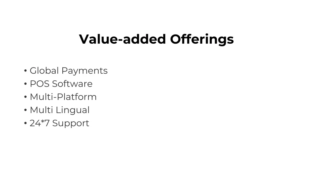 Value-added Offerings • Global Payments • POS Software • Multi-Platform • Multi Lingual • 24*7 Support