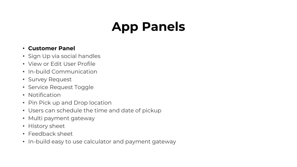 App Panels • Customer Panel • Sign Up via social handles • View or Edit User Profile • In-build Communication • Survey Request • Service Request Toggle • Notification • Pin Pick up and Drop location • Users can schedule the time and date of pickup • Multi payment gateway • History sheet • Feedback sheet • In-build easy to use calculator and payment gateway