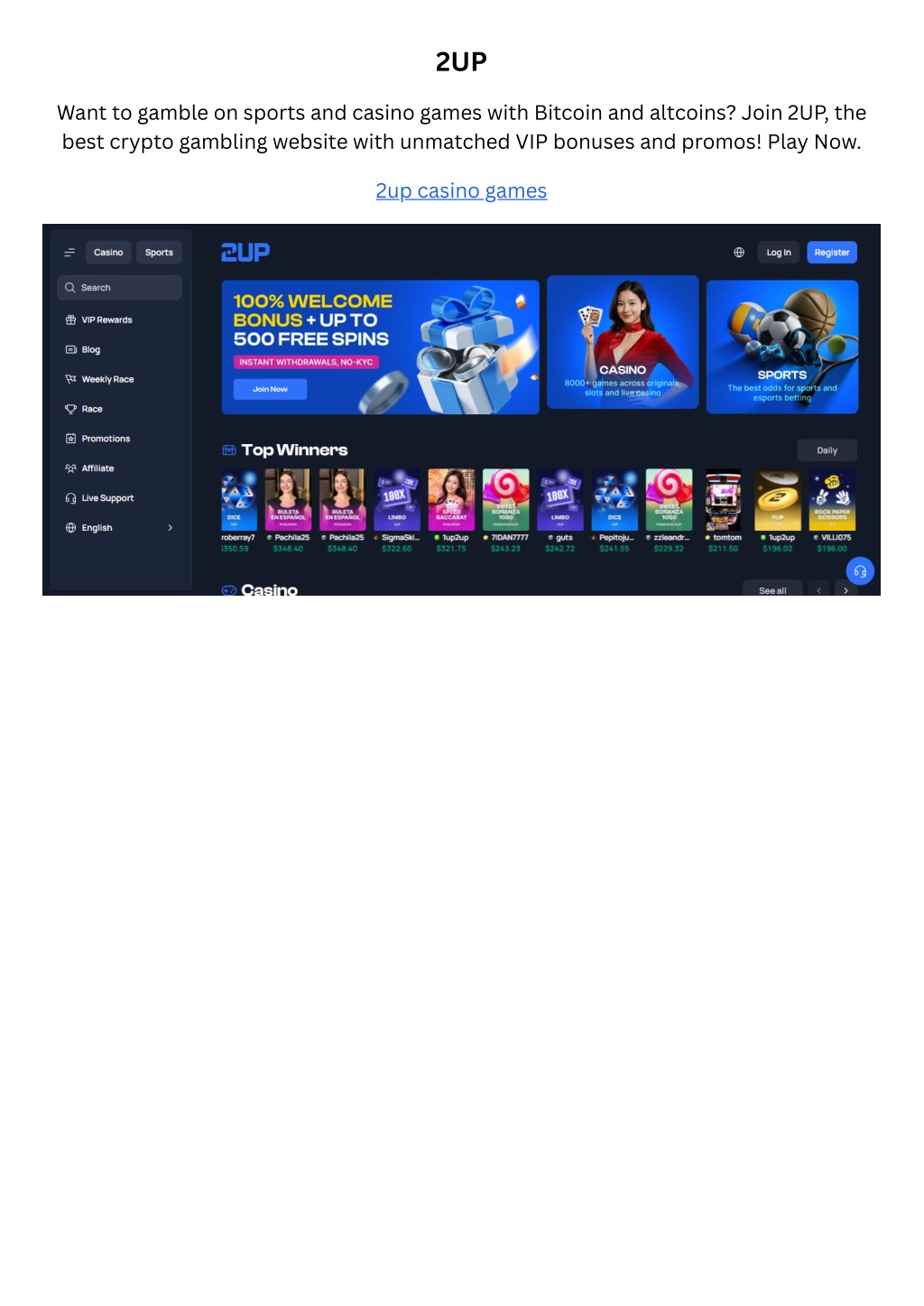 2UP Want to gamble on sports and casino games with Bitcoin and altcoins? Join 2UP, the best crypto gambling website with unmatched VIP bonuses and promos! Play Now. 2up casino games