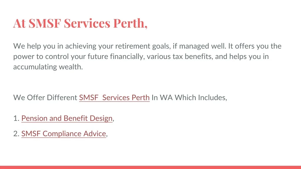 At SMSF Services Perth, We help you in achieving your retirement goals, if managed well. It offers you the power to control your future financially, various tax benefits, and helps you in accumulating wealth. We Offer Different SMSF Services Perth In WA Which Includes,1. Pension and Benefit Design, 2. SMSF Compliance Advice,
