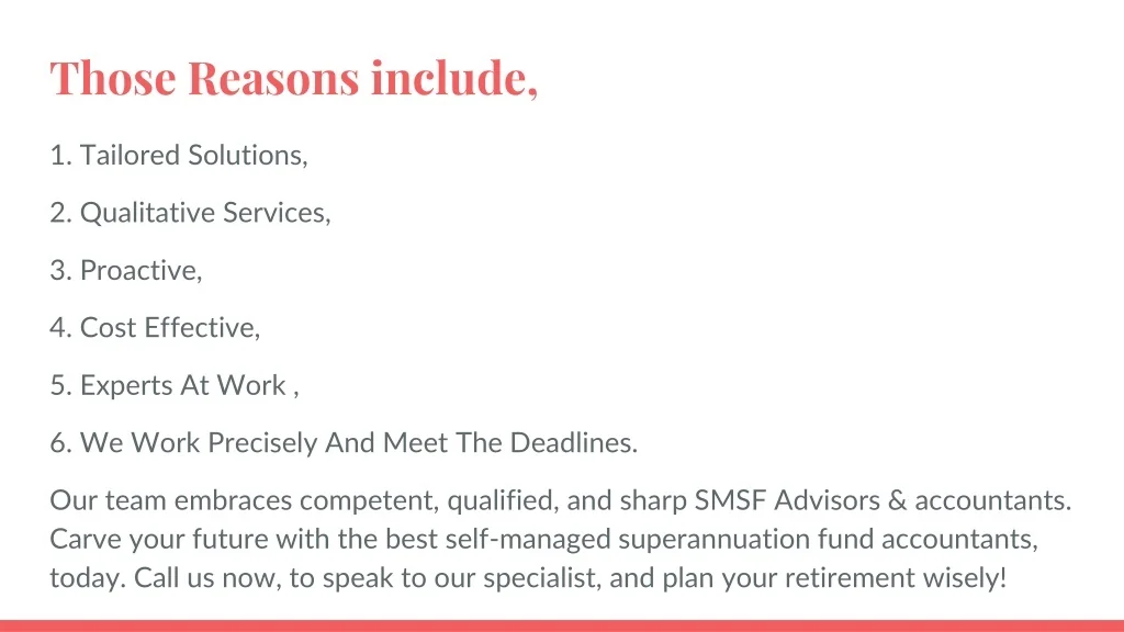 Those Reasons include, 1. Tailored Solutions, 2. Qualitative Services, 3. Proactive, 4. Cost Effective, 5. Experts At Work , 6. We Work Precisely And Meet The Deadlines. Our team embraces competent, qualified, and sharp SMSF Advisors & accountants. Carve your future with the best self-managed superannuation fund accountants, today. Call us now, to speak to our specialist, and plan your retirement wisely!
