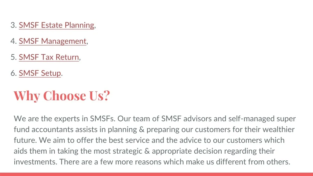 Why Choose Us? 3. SMSF Estate Planning, 4. SMSF Management, 5. SMSF Tax Return, 6. SMSF Setup. We are the experts in SMSFs. Our team of SMSF advisors and self-managed super fund accountants assists in planning & preparing our customers for their wealthier future. We aim to offer the best service and the advice to our customers which aids them in taking the most strategic & appropriate decision regarding their investments. There are a few more reasons which make us different from others.