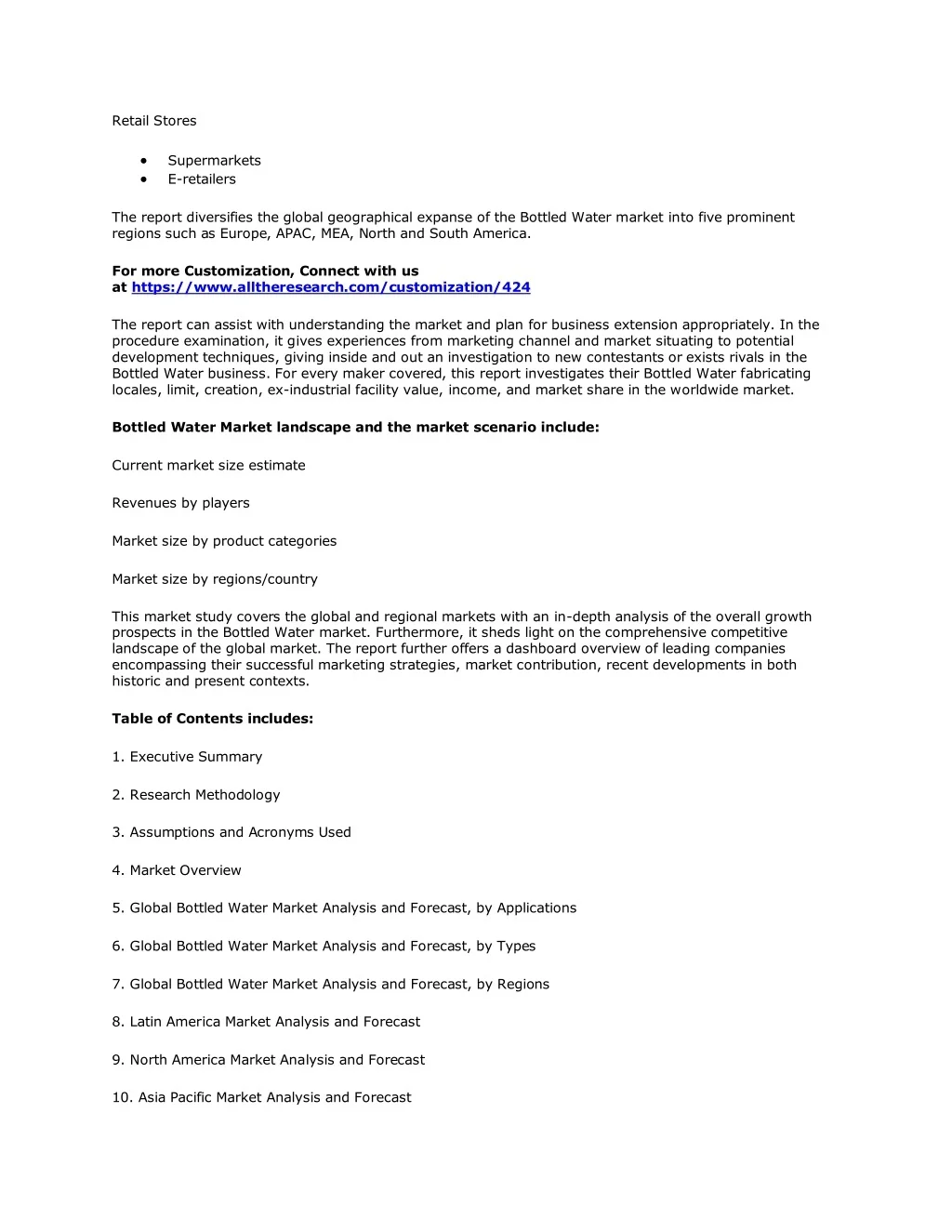 Retail Stores Supermarkets E-retailers The report diversifies the global geographical expanse of the Bottled Water market into five prominent regions such as Europe, APAC, MEA, North and South America. For more Customization, Connect with us at https://www.alltheresearch.com/customization/424 The report can assist with understanding the market and plan for business extension appropriately. In the procedure examination, it gives experiences from marketing channel and market situating to potential development techniques, giving inside and out an investigation to new contestants or exists rivals in the Bottled Water business. For every maker covered, this report investigates their Bottled Water fabricating locales, limit, creation, ex-industrial facility value, income, and market share in the worldwide market. Bottled Water Market landscape and the market scenario include: Current market size estimate Revenues by players Market size by product categories Market size by regions/country This market study covers the global and regional markets with an in-depth analysis of the overall growth prospects in the Bottled Water market. Furthermore, it sheds light on the comprehensive competitive landscape of the global market. The report further offers a dashboard overview of leading companies encompassing their successful marketing strategies, market contribution, recent developments in both historic and present contexts. Table of Contents includes: 1. Executive Summary 2. Research Methodology 3. Assumptions and Acronyms Used 4. Market Overview 5. Global Bottled Water Market Analysis and Forecast, by Applications 6. Global Bottled Water Market Analysis and Forecast, by Types 7. Global Bottled Water Market Analysis and Forecast, by Regions 8. Latin America Market Analysis and Forecast 9. North America Market Analysis and Forecast 10. Asia Pacific Market Analysis and Forecast