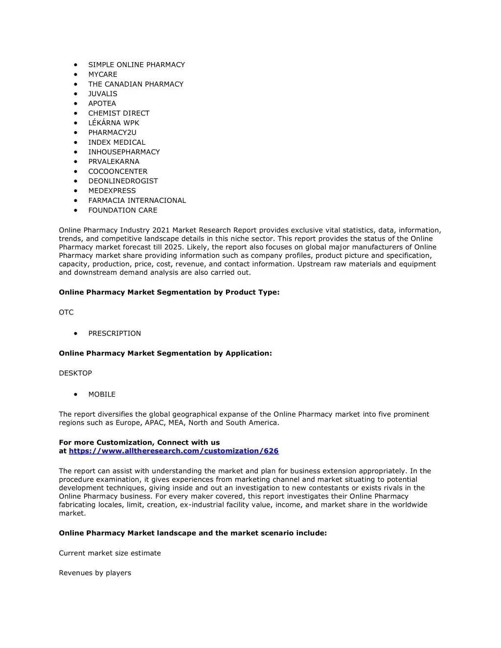 SIMPLE ONLINE PHARMACY MYCARE THE CANADIAN PHARMACY JUVALIS APOTEA CHEMIST DIRECT LÉKÁRNA WPK PHARMACY2U INDEX MEDICAL INHOUSEPHARMACY PRVALEKARNA COCOONCENTER DEONLINEDROGIST MEDEXPRESS FARMACIA INTERNACIONAL FOUNDATION CARE Online Pharmacy Industry 2021 Market Research Report provides exclusive vital statistics, data, information, trends, and competitive landscape details in this niche sector. This report provides the status of the Online Pharmacy market forecast till 2025. Likely, the report also focuses on global major manufacturers of Online Pharmacy market share providing information such as company profiles, product picture and specification, capacity, production, price, cost, revenue, and contact information. Upstream raw materials and equipment and downstream demand analysis are also carried out. Online Pharmacy Market Segmentation by Product Type: OTC PRESCRIPTION Online Pharmacy Market Segmentation by Application: DESKTOP MOBILE The report diversifies the global geographical expanse of the Online Pharmacy market into five prominent regions such as Europe, APAC, MEA, North and South America. For more Customization, Connect with us at https://www.alltheresearch.com/customization/626 The report can assist with understanding the market and plan for business extension appropriately. In the procedure examination, it gives experiences from marketing channel and market situating to potential development techniques, giving inside and out an investigation to new contestants or exists rivals in the Online Pharmacy business. For every maker covered, this report investigates their Online Pharmacy fabricating locales, limit, creation, ex-industrial facility value, income, and market share in the worldwide market. Online Pharmacy Market landscape and the market scenario include: Current market size estimate Revenues by players